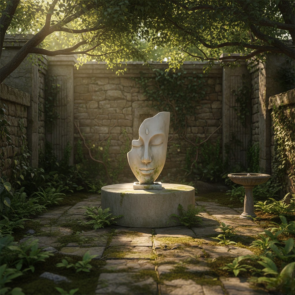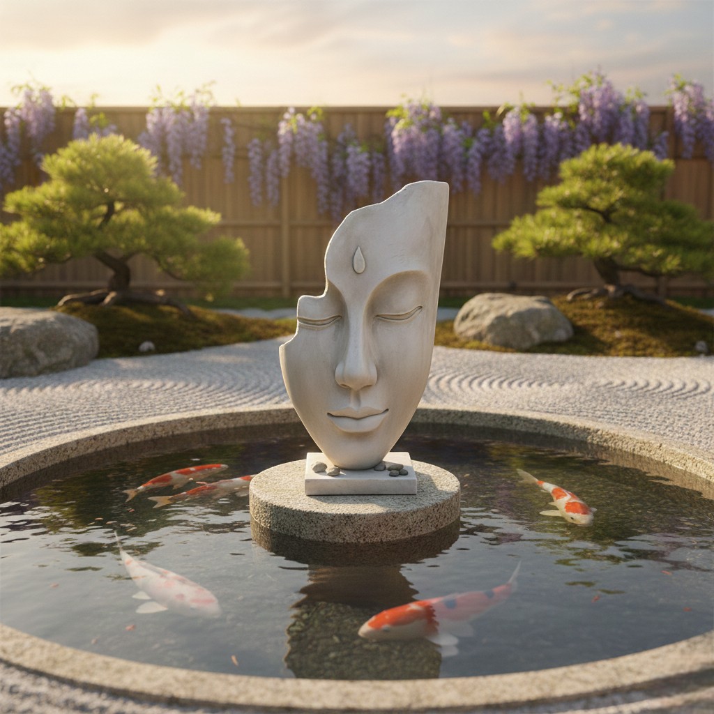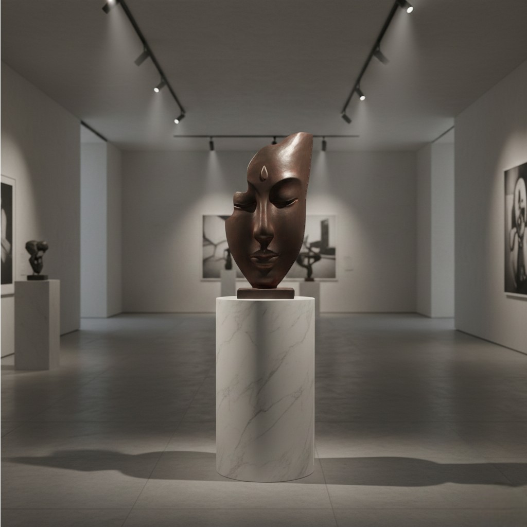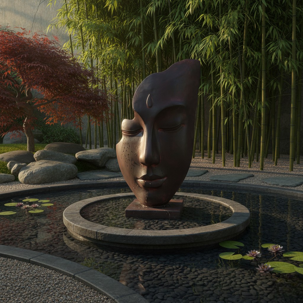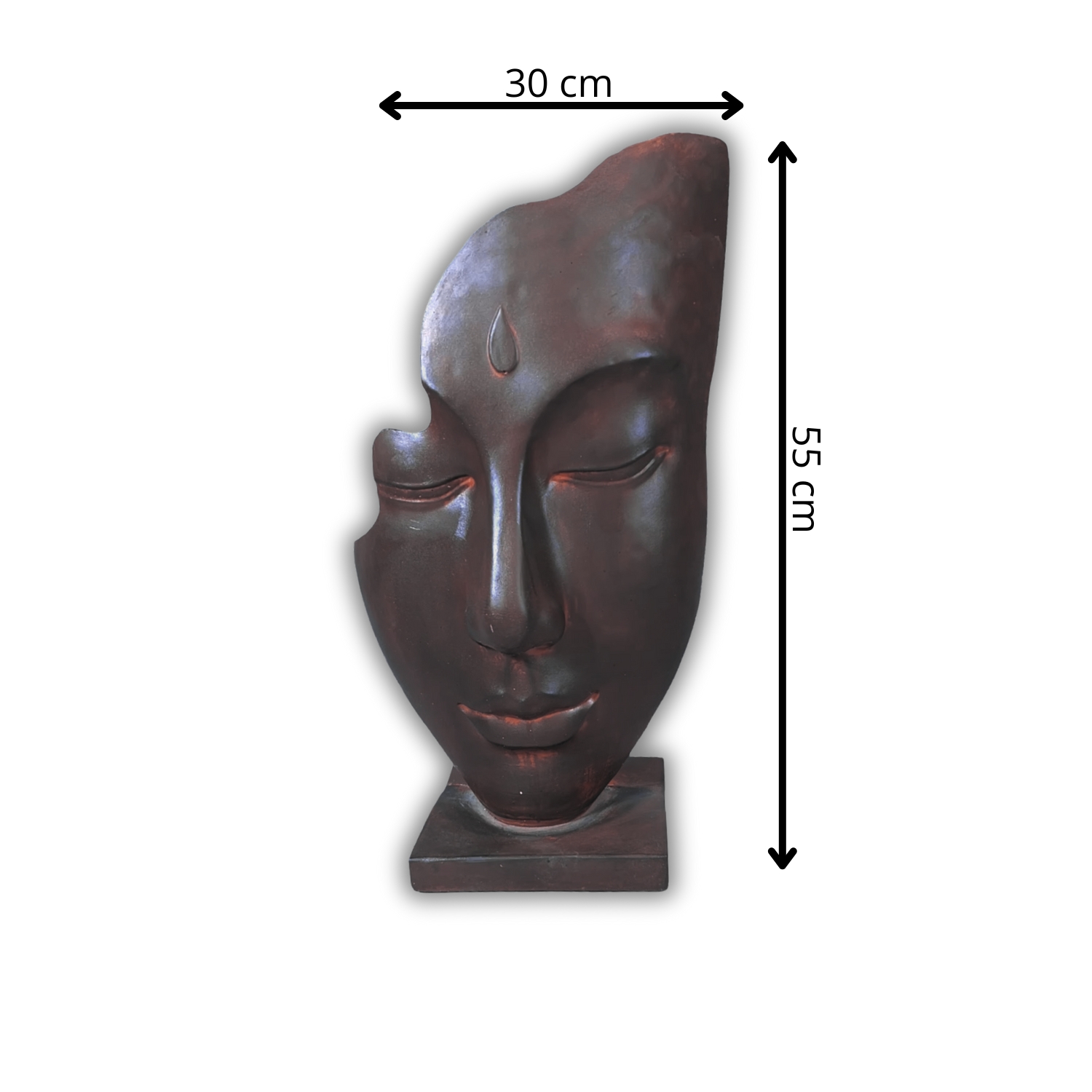 Diseño: escultura decorativa de rostro sereno estilo zen, con base cuadrada y detalle en la frente.