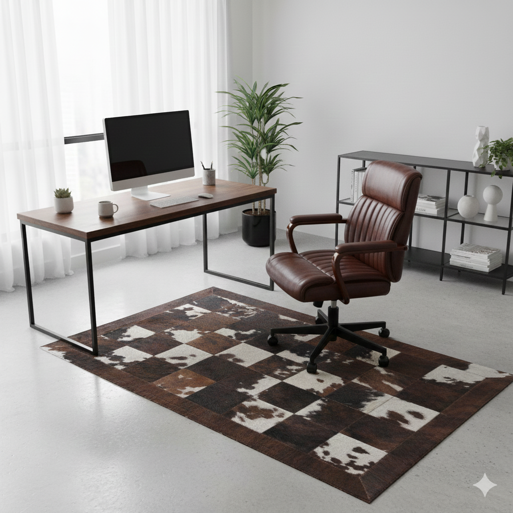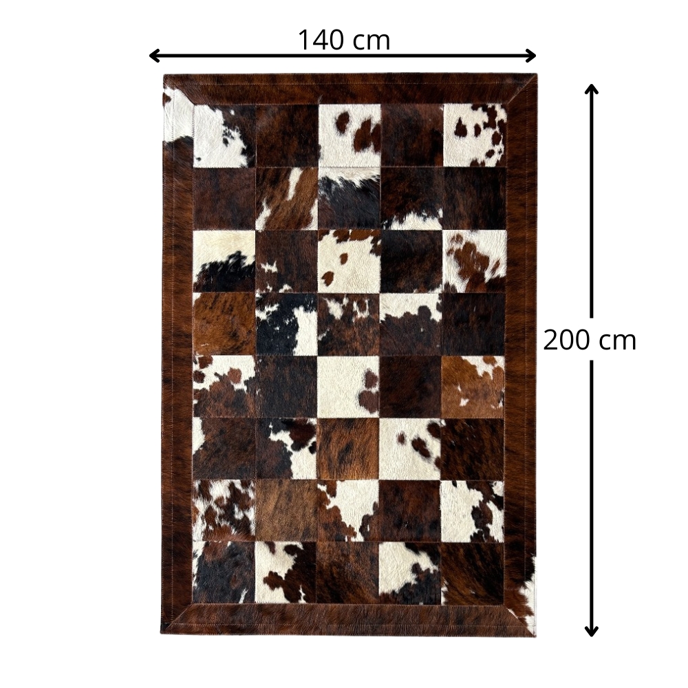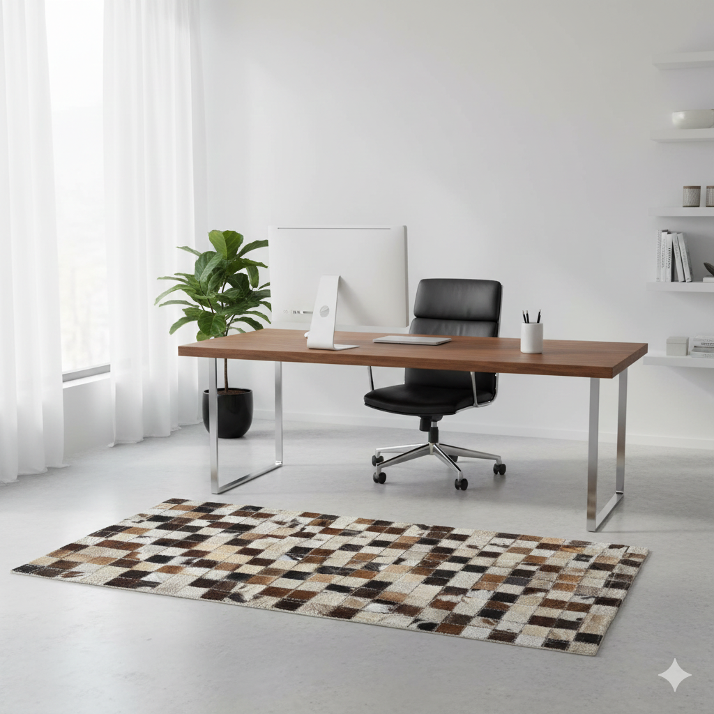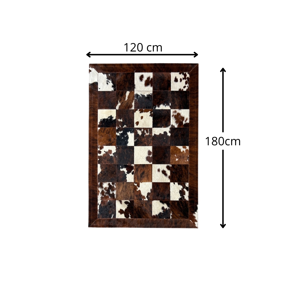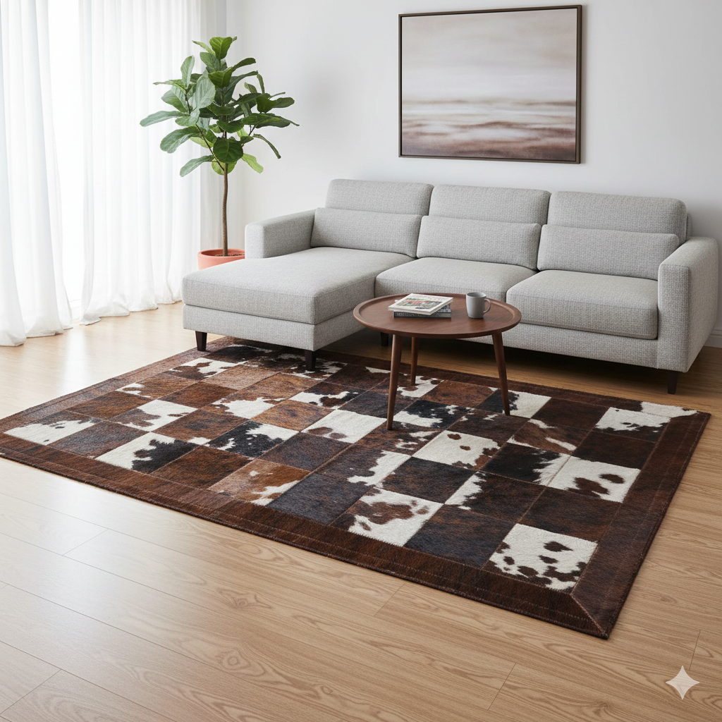 Los tonos tierra —marrón, crema, beige y detalles en negro— se integran fácilmente en decoraciones nórdicas, rústicas, modernas o minimalistas, convirtiendo esta alfombra en un acento perfecto para realzar salones, dormitorios, pasillos o recibidores. Cada pieza es única, con variaciones naturales propias de la piel que le otorgan un carácter exclusivo.
