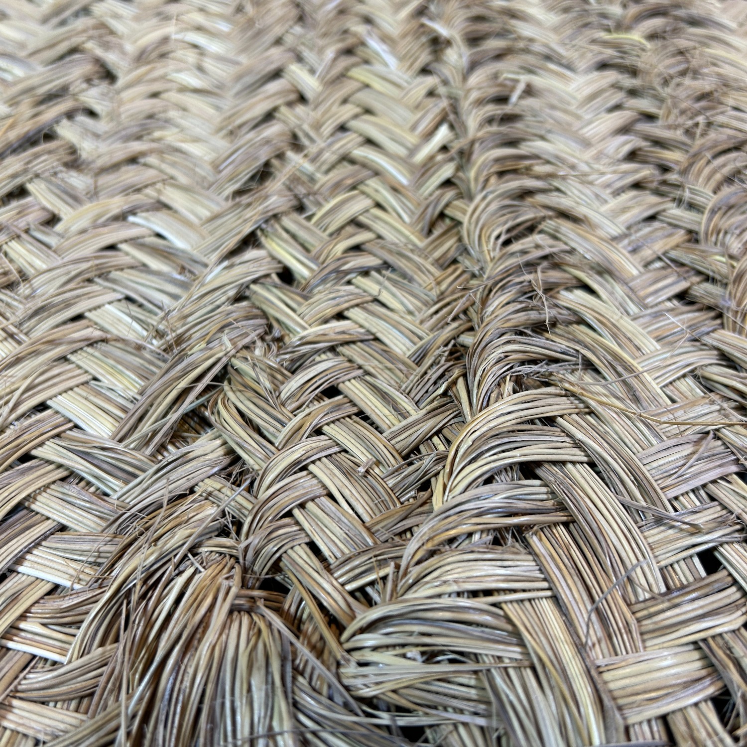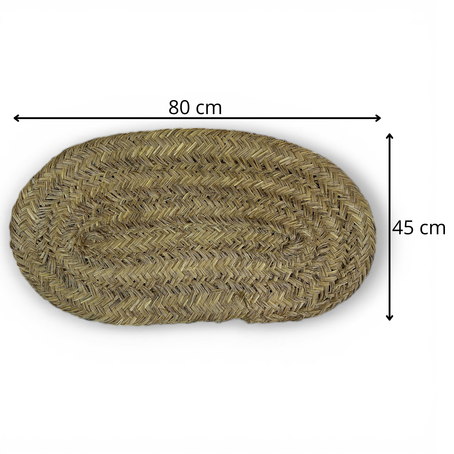 Diseño: alfombrilla ovalada de esparto, trenzado artesanal con textura marcada.