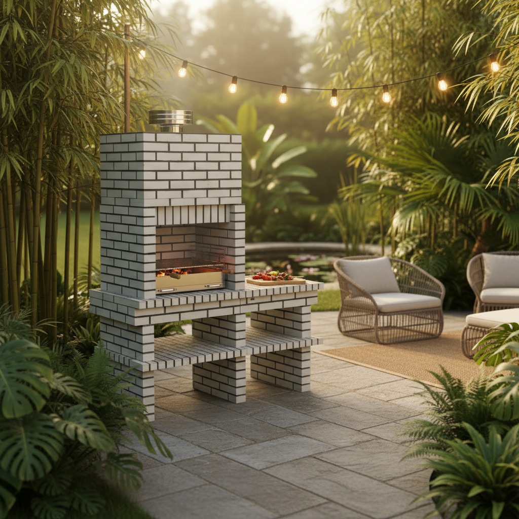 Esta barbacoa de ladrillo refractario en color crema con chimenea, esta diseñada para ofrecerte una experiencia de cocción única y sin humo.