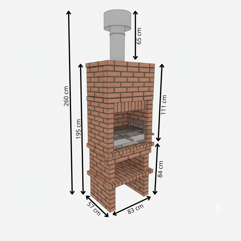 Altura total: 260 cm (cuerpo 195 cm + chimenea 65 cm).