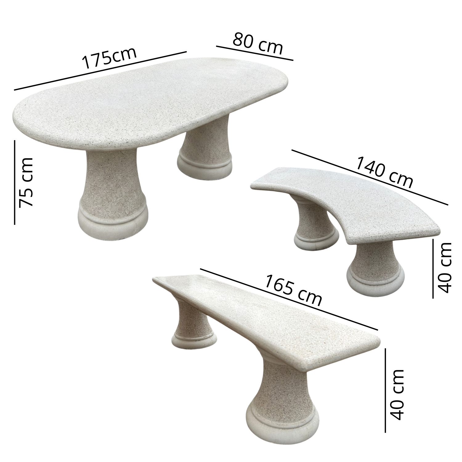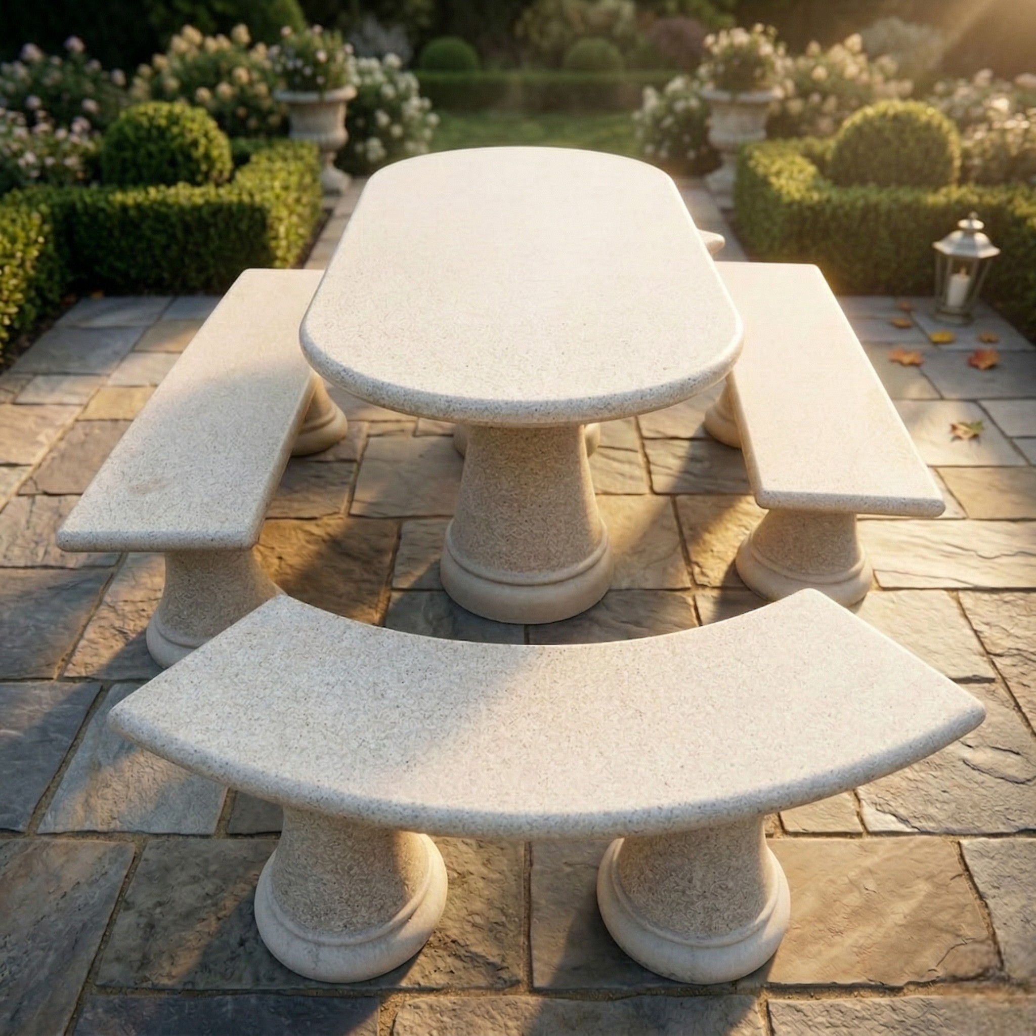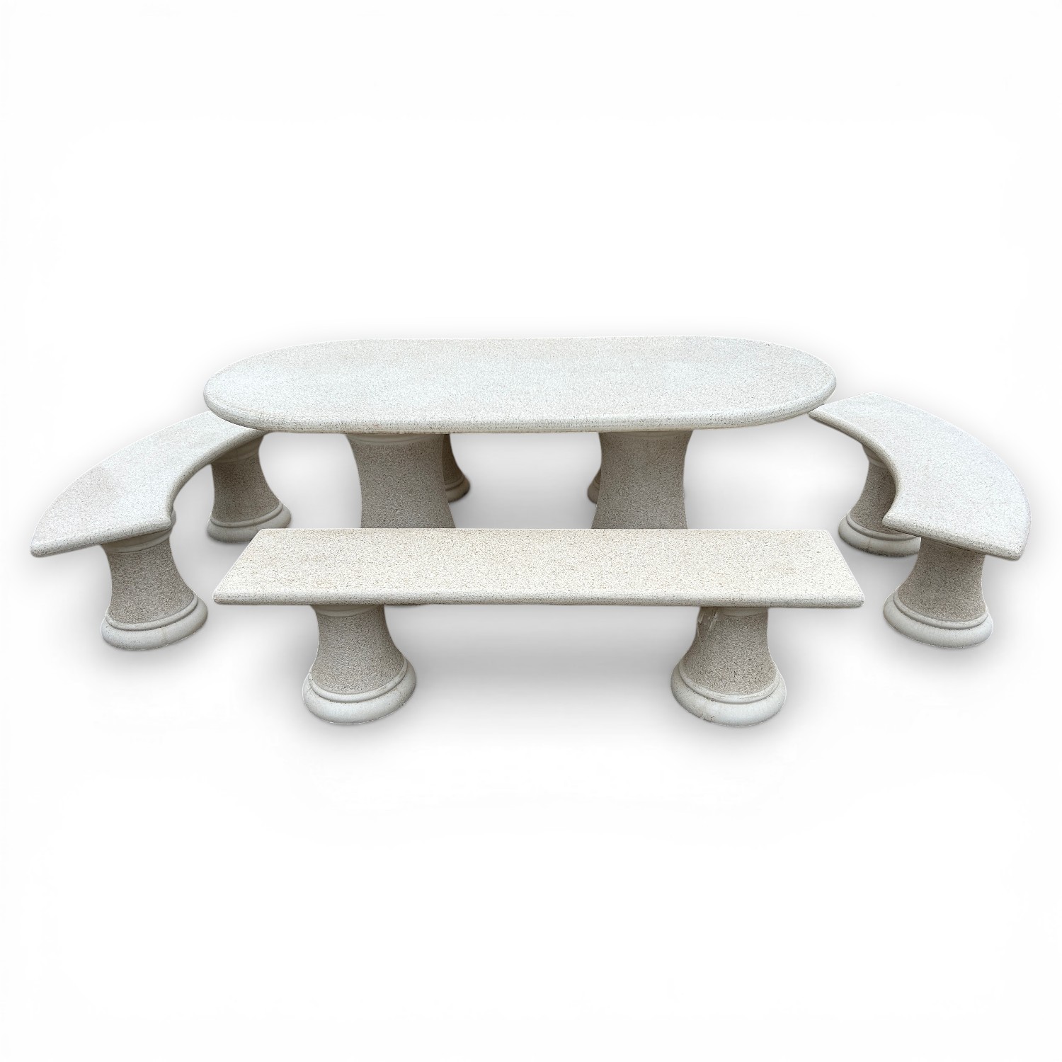 Este conjunto de mesa de granito para exterior es una opción perfecta para crear una zona de reunión elegante, resistente y con mucha presencia en jardines, terrazas y patios. Su composición completa, formada por una mesa ovalada, dos bancos curvos y dos bancos rectos, permite crear un espacio equilibrado, cómodo y muy decorativo para disfrutar al aire libre.