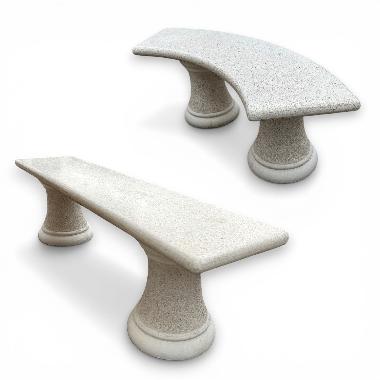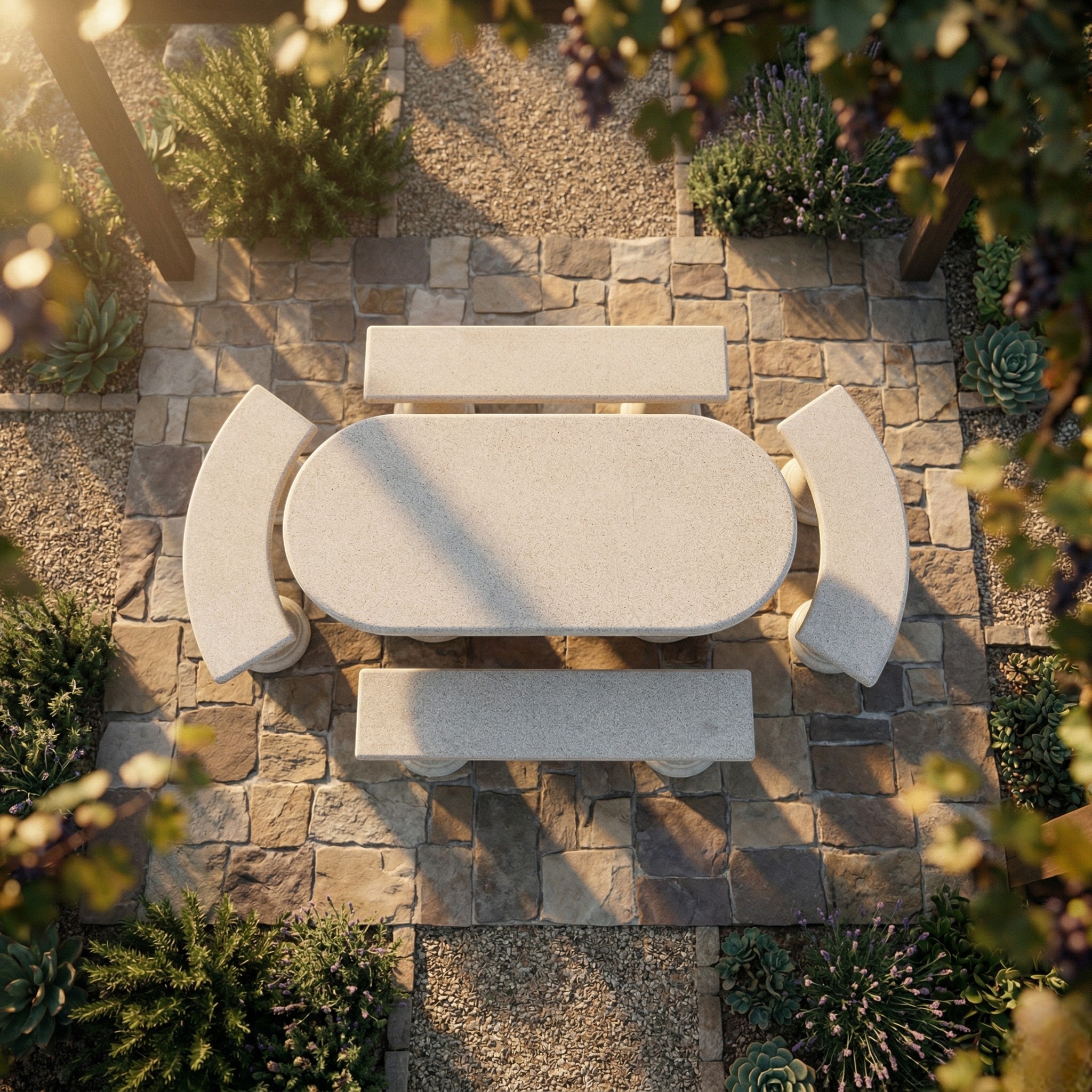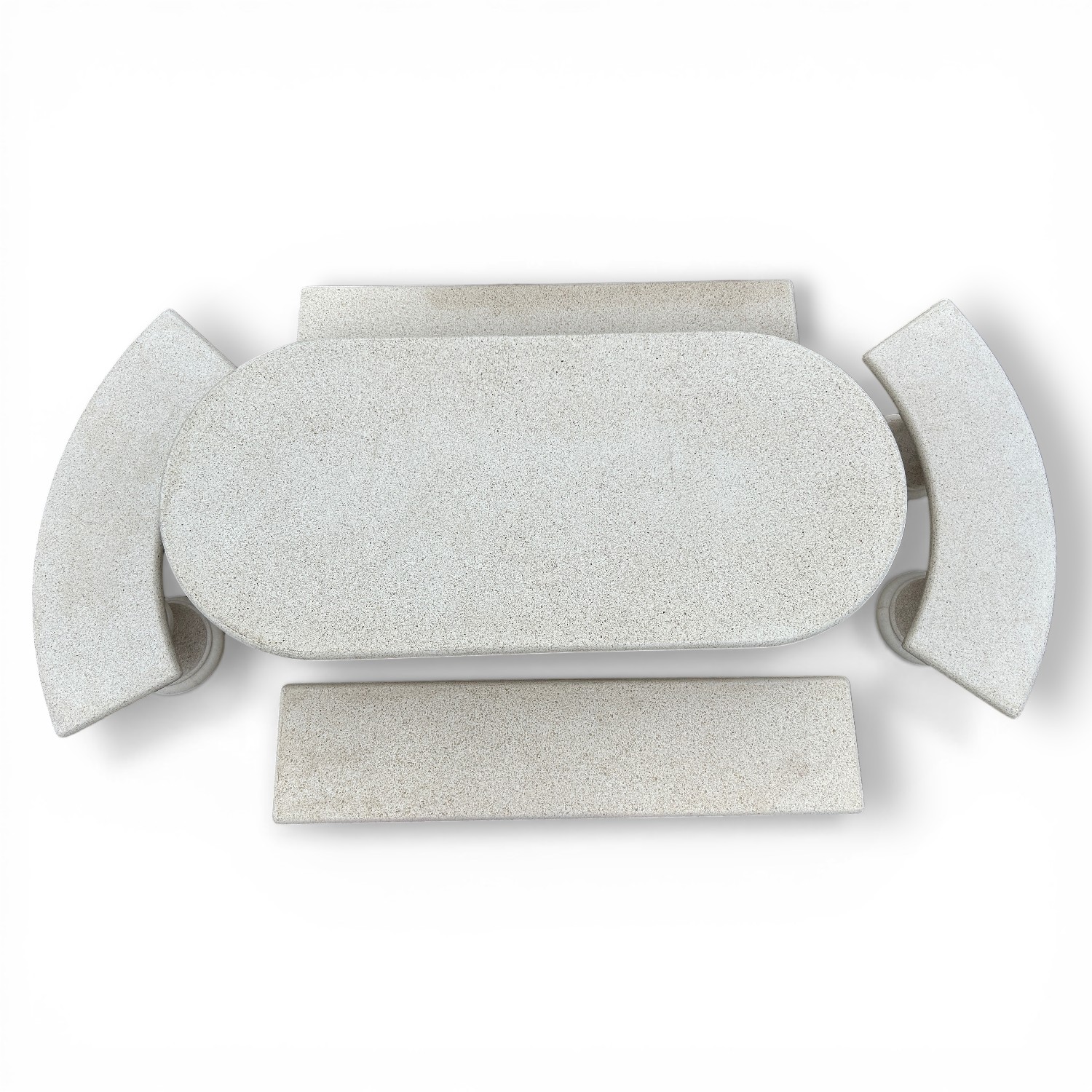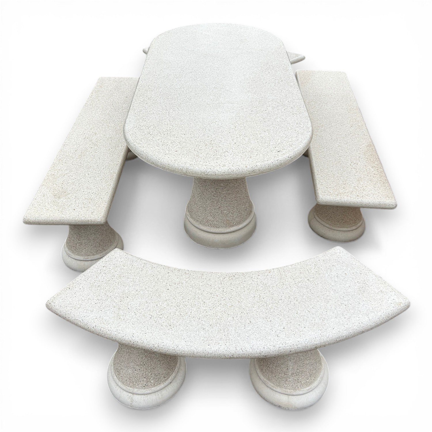 Este conjunto de mesa de granito para exterior es una opción perfecta para crear una zona de reunión elegante, resistente y con mucha presencia en jardines, terrazas y patios. Su composición completa, formada por una mesa ovalada, dos bancos curvos y dos bancos rectos, permite crear un espacio equilibrado, cómodo y muy decorativo para disfrutar al aire libre.