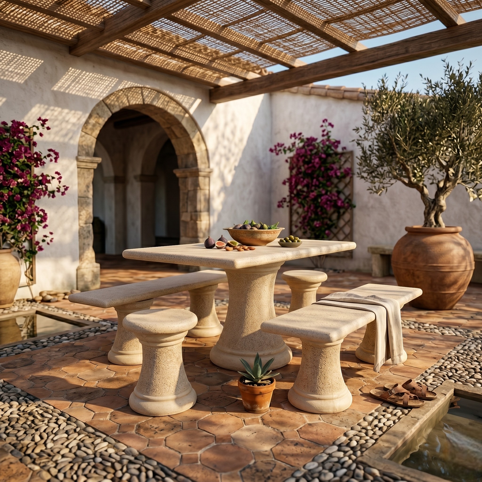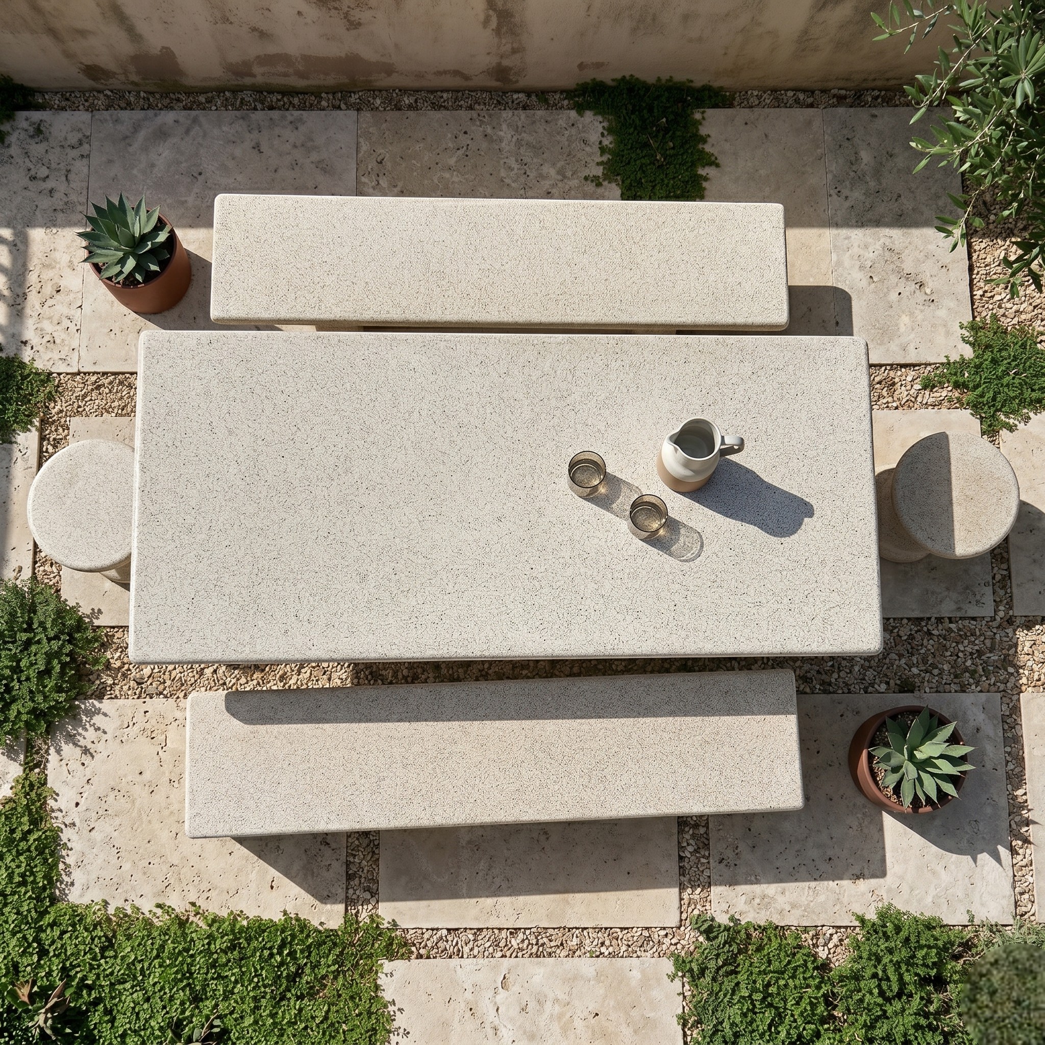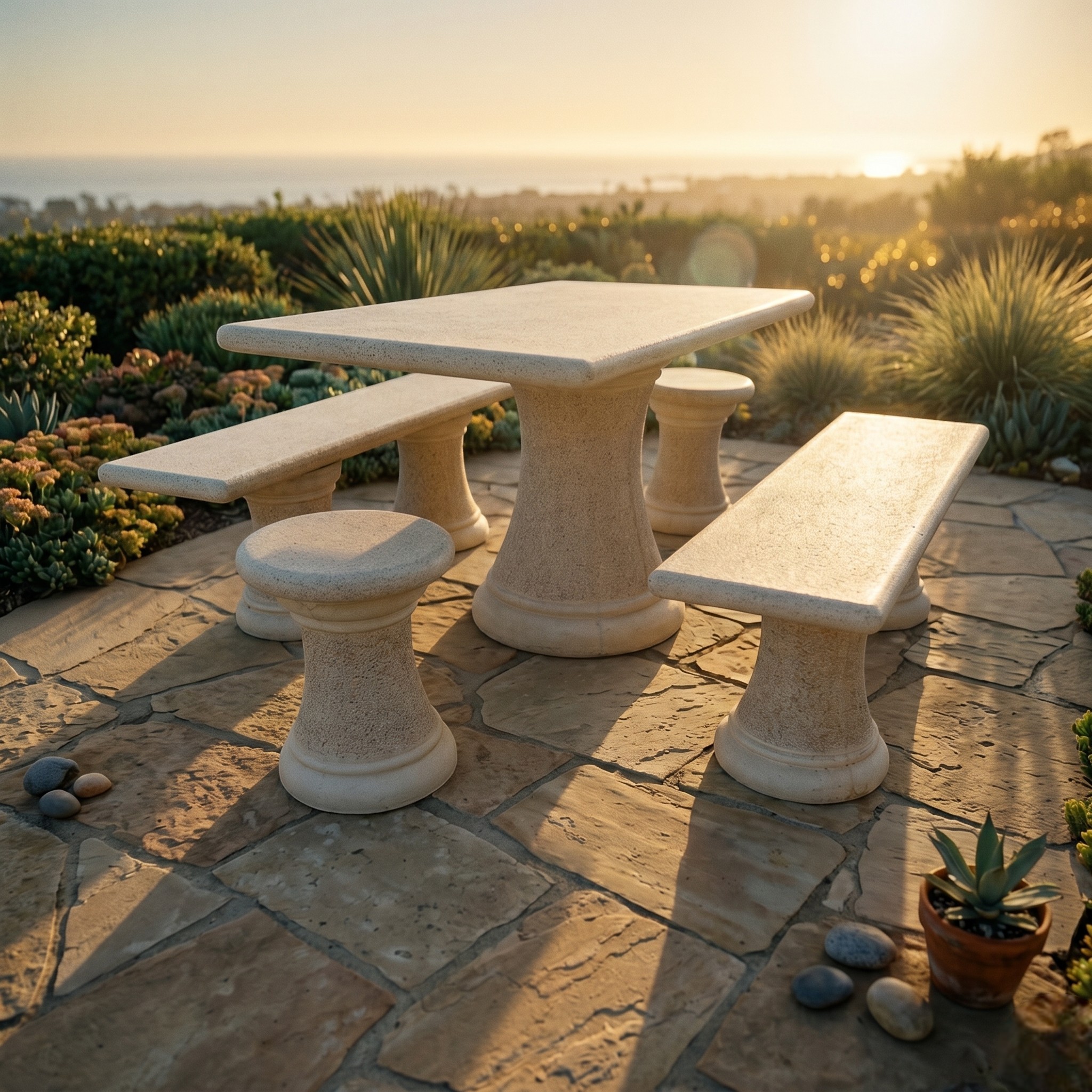 Gracias a su fabricación en granito, se trata de un conjunto robusto, estable y 100% resistente a exterior, pensado para durar y para vestir cualquier zona exterior con una imagen cuidada y decorativa. Es una opción ideal para quienes quieren algo más que una simple mesa de jardín y buscan un conjunto con personalidad, presencia y utilidad real.