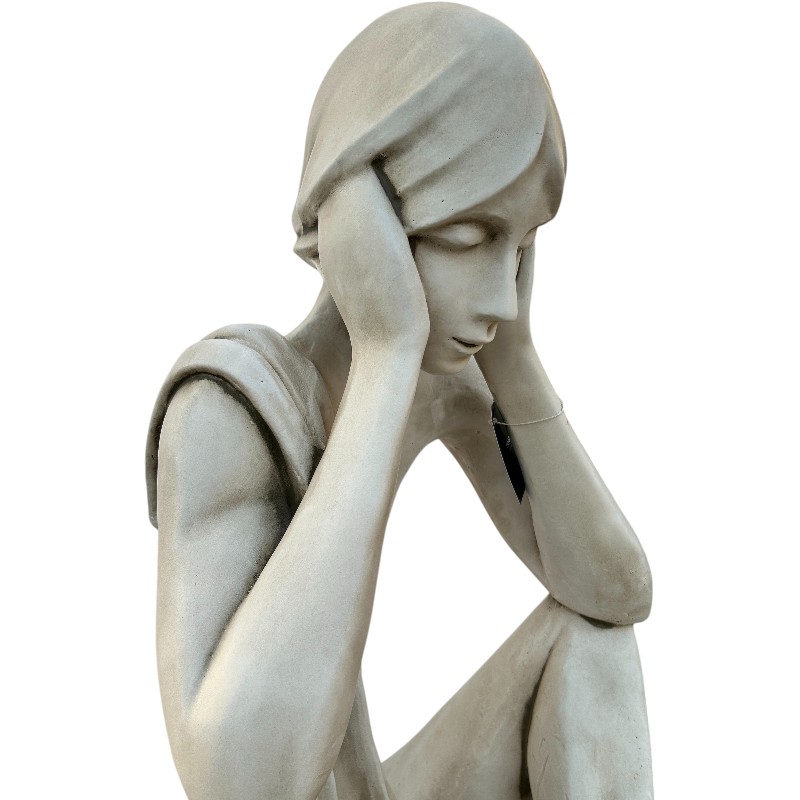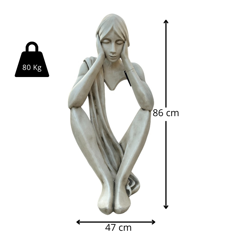 Esta escultura de mujer sentada de piedra (86 cm) aporta una sensación inmediata de calma y elegancia. Su postura recogida y su expresión serena transmiten un estilo moderno y contemplativo, perfecto para crear un rincón con personalidad.