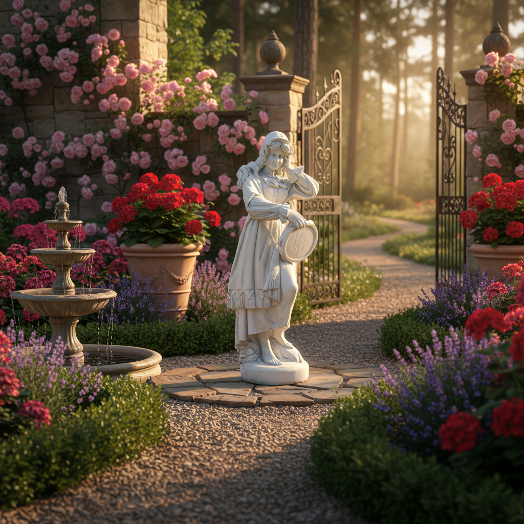 El acabado en piedra clara combina de maravilla con ambientes mediterráneos, piedra natural, madera y vegetación. Y si le añades iluminación cálida por la noche, resaltará aún más el relieve de la ropa y los detalles del rostro, creando un efecto muy escénico.