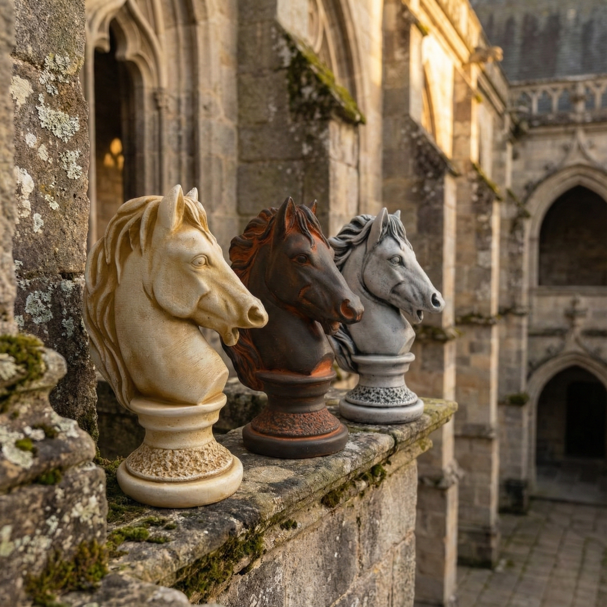 Diseño: gárgola decorativa en forma de cabeza de caballo sobre peana, con relieves marcados y acabado envejecido.