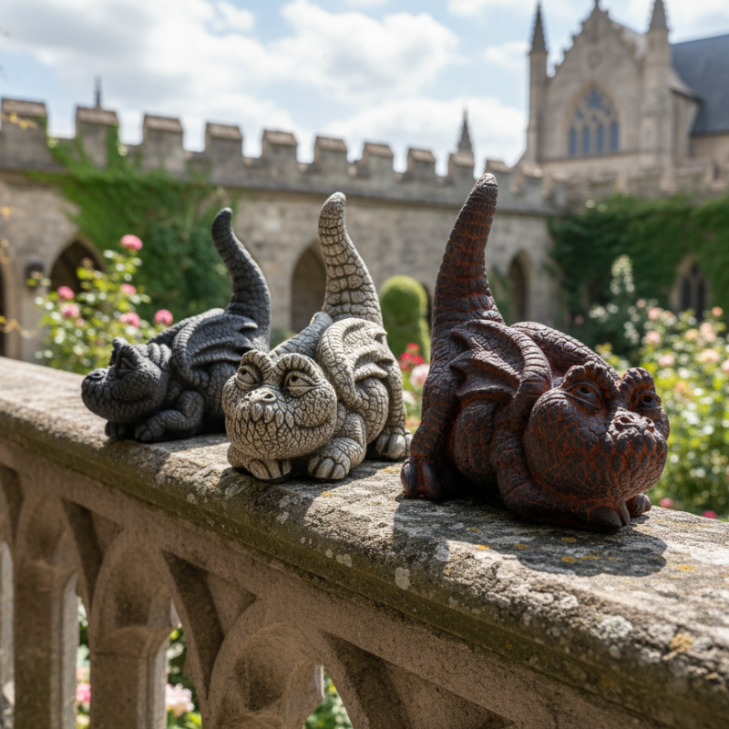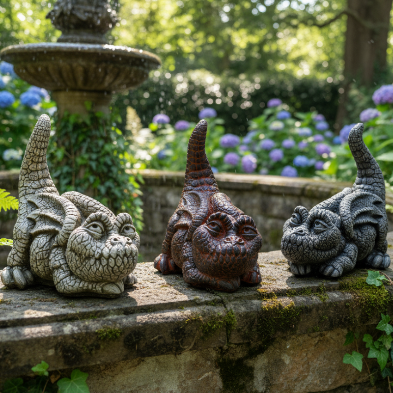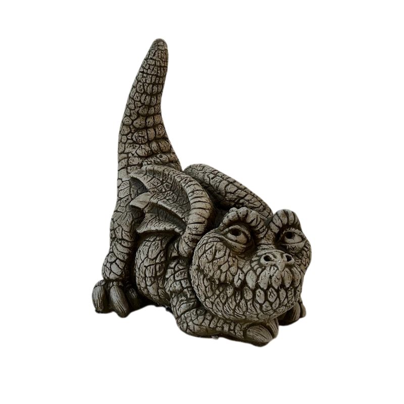 Diseño: figura decorativa tipo dragón en postura agachada, con textura de escamas y cola elevada; estilo gárgola simpática para jardín.
