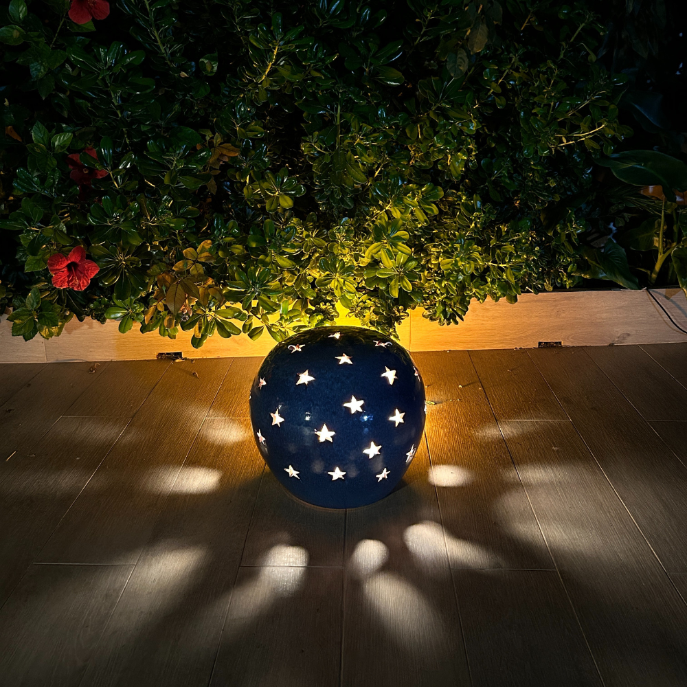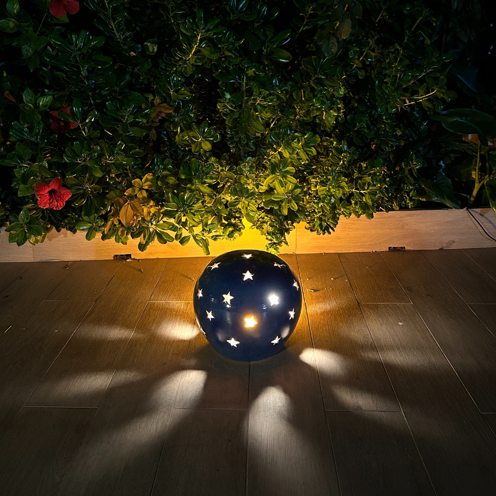 Esta lámpara de barro esmaltado es una esfera luminosa con recortes en forma de estrellas, que proyecta una luz cálida y decorativa diseñadas para transformar cualquier rincón en un lugar mágico y acogedor.
