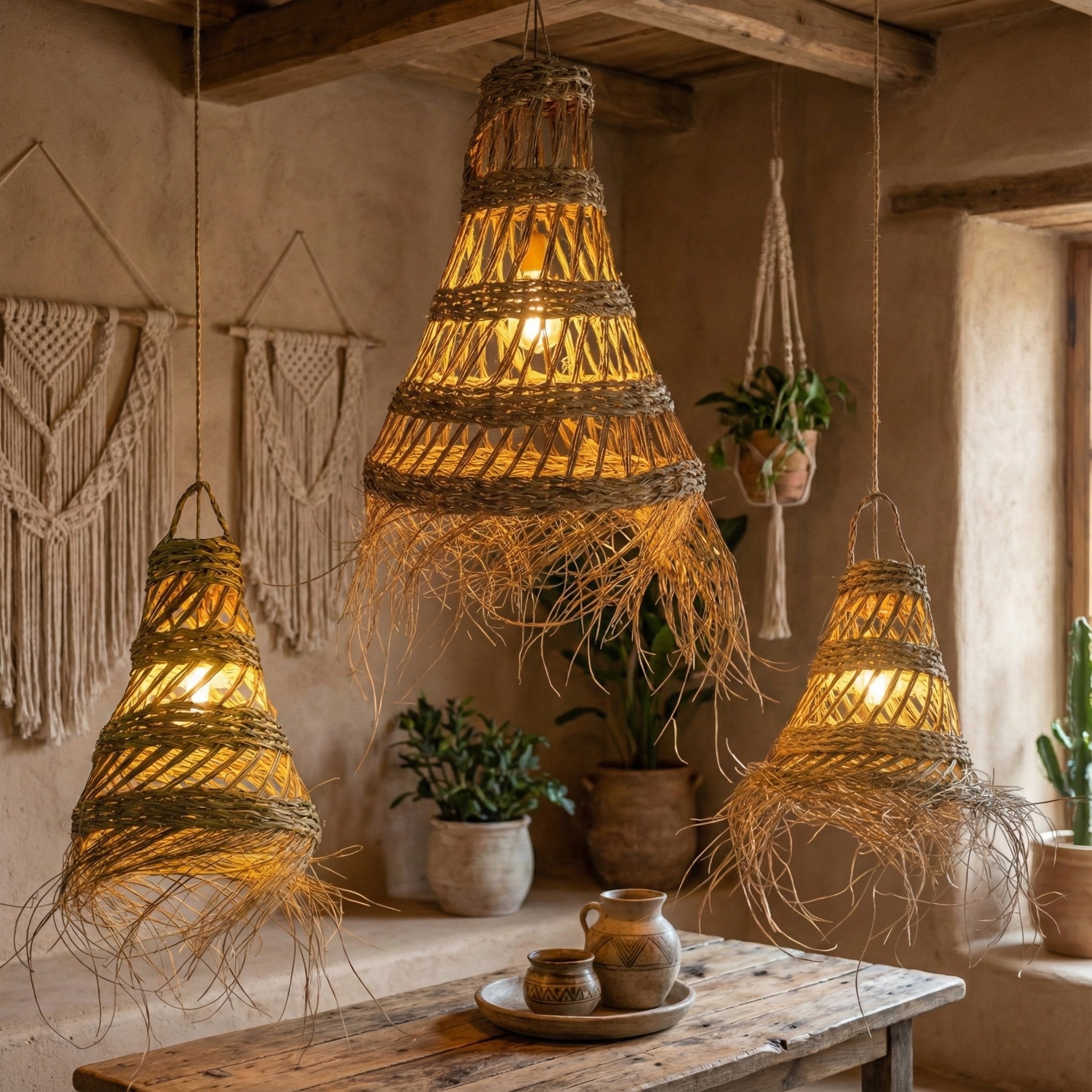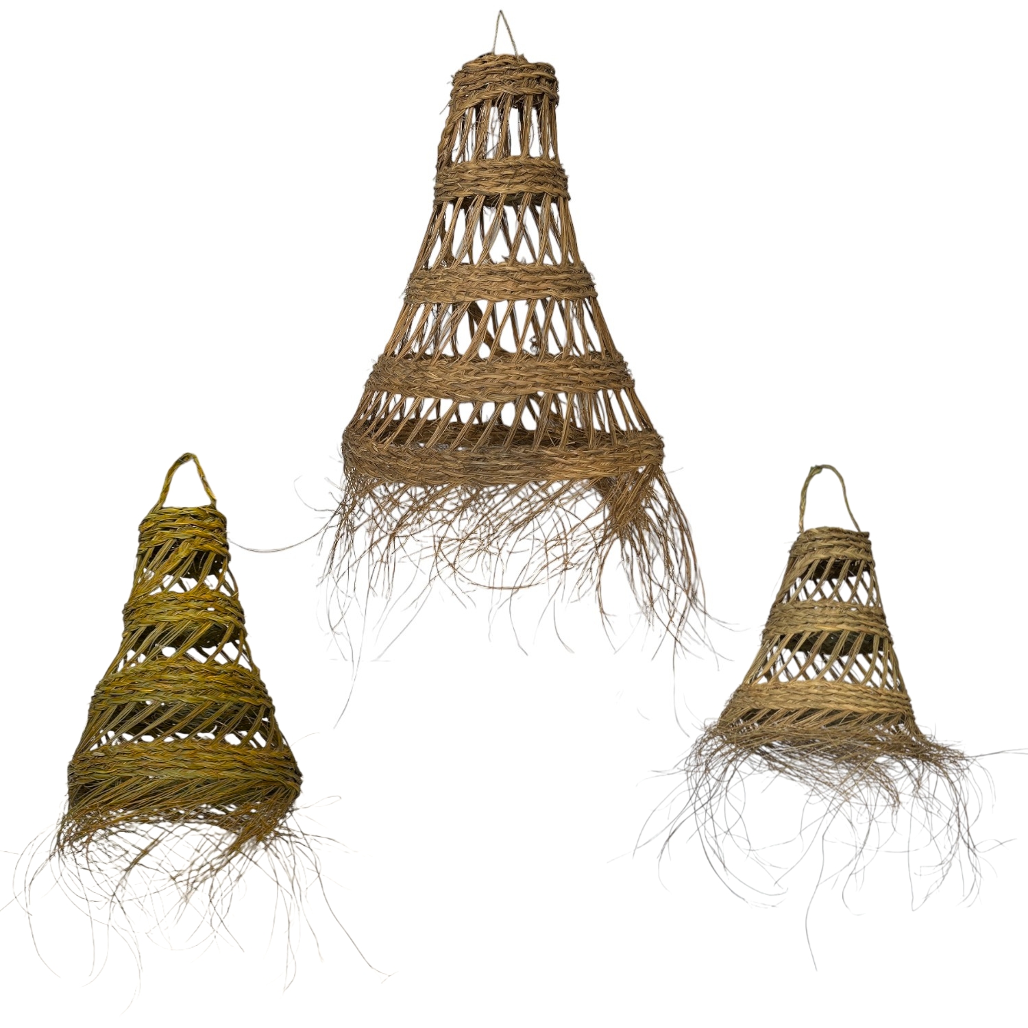 Dale a tu casa ese toque mediterráneo y natural con esta lámpara de techo de esparto de diseño calado. Su trenzado artesanal y los flecos decorativos crean una pieza con mucha personalidad: ligera visualmente, cálida y perfecta para ambientes boho, rústicos o costeros.
