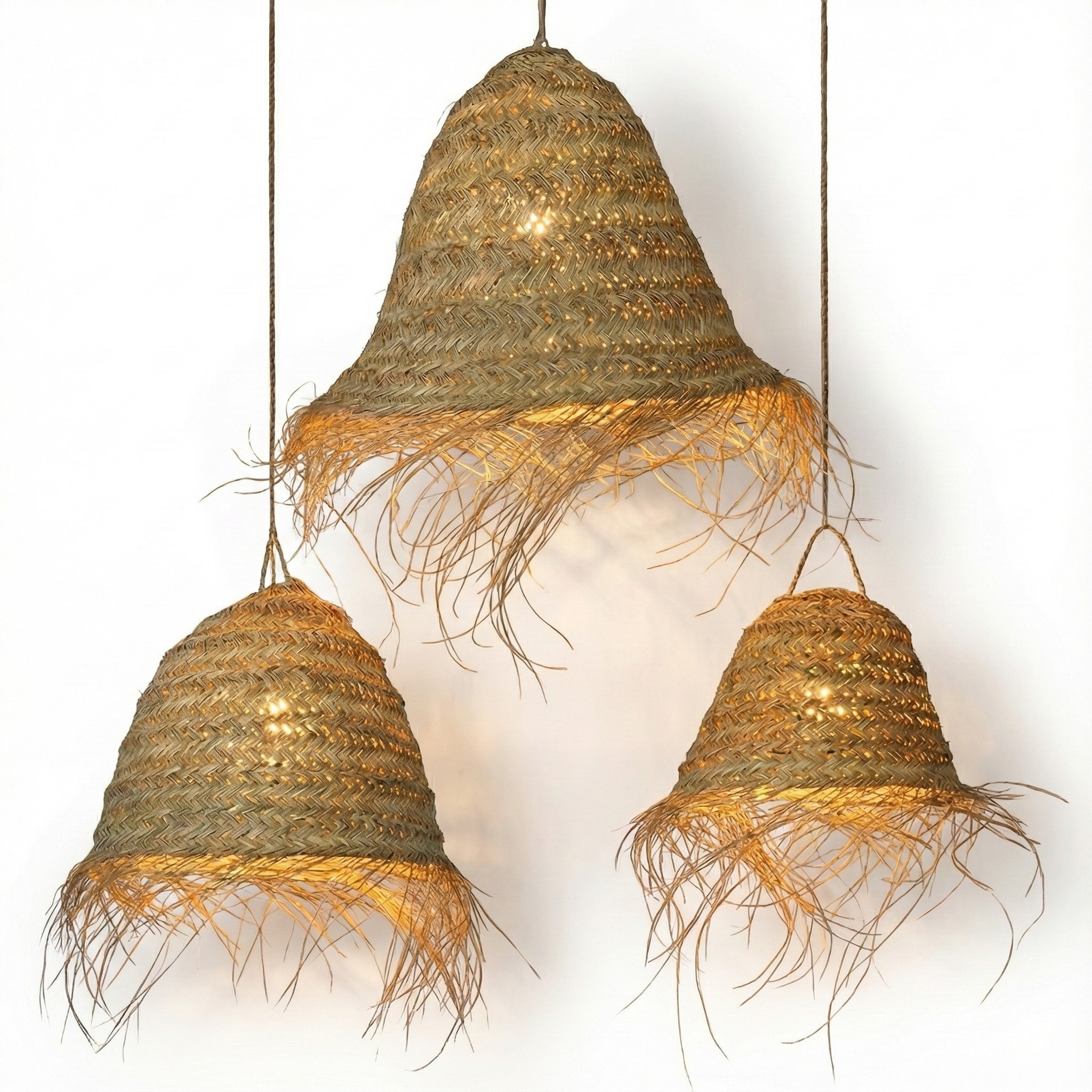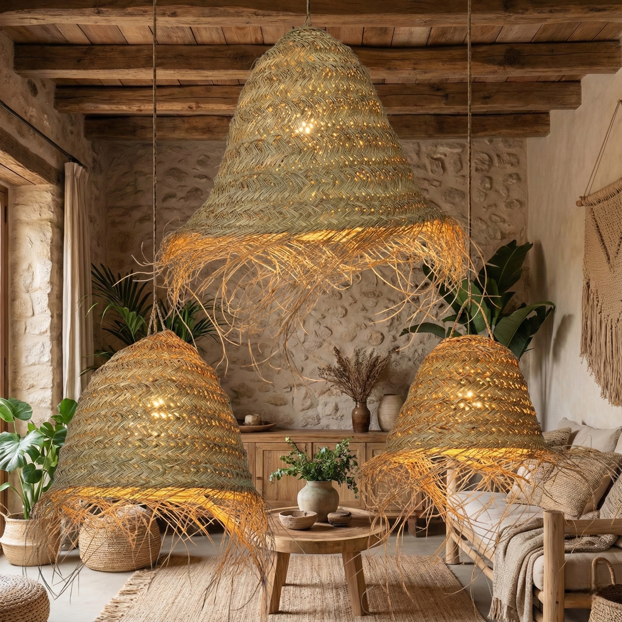 Disponible en tres tamaños, puedes colocarla como punto focal en una estancia o combinar varias para crear una composición con diferentes alturas (perfecta sobre mesa de comedor, isla, barra o escalera). Su tono natural encaja fácil con decoraciones ibicencas, boho, rústicas o costeras, aportando un look acogedor y auténtico sin recargar.