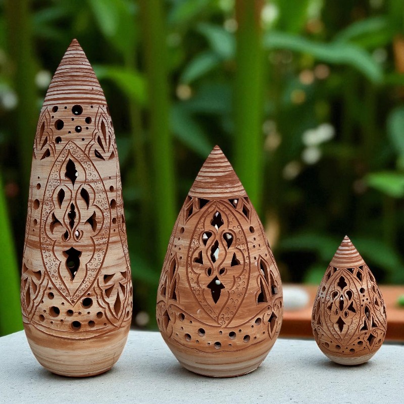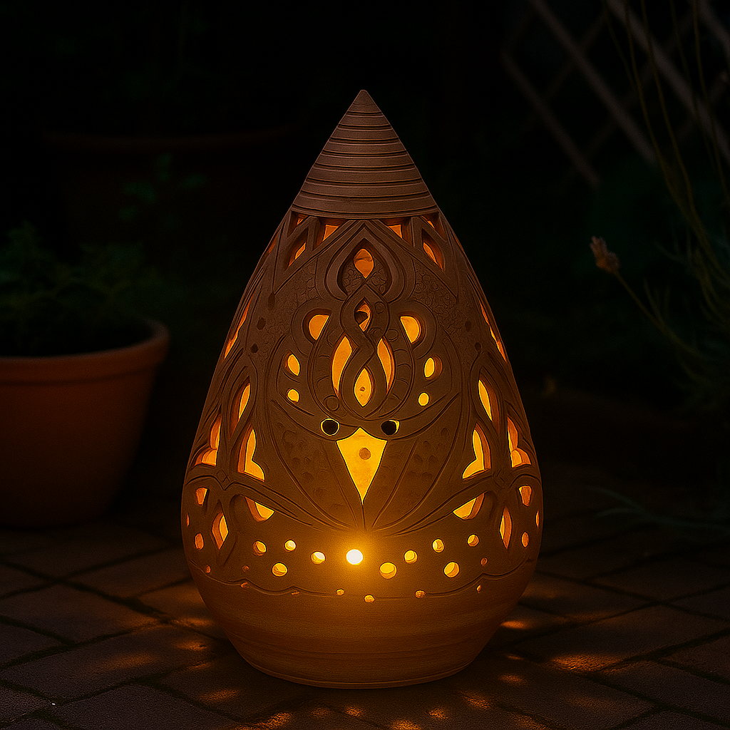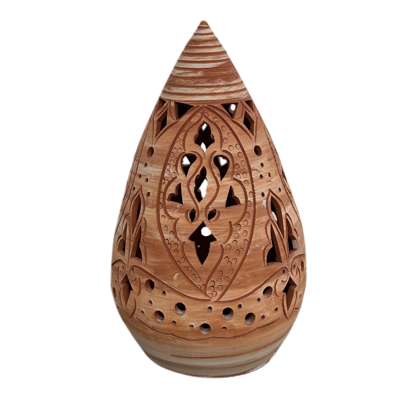 Es una lámpara decorativa en forma de gota con finos calados a mano, inspirados en patrones árabes. Es una pieza artesanal, hecha a mano en barro. Es ideal para crear ambientes acogedores con un toque rustico y original e iluminar espacios con calidez y encanto como tu salón, la terraza o el jardín.