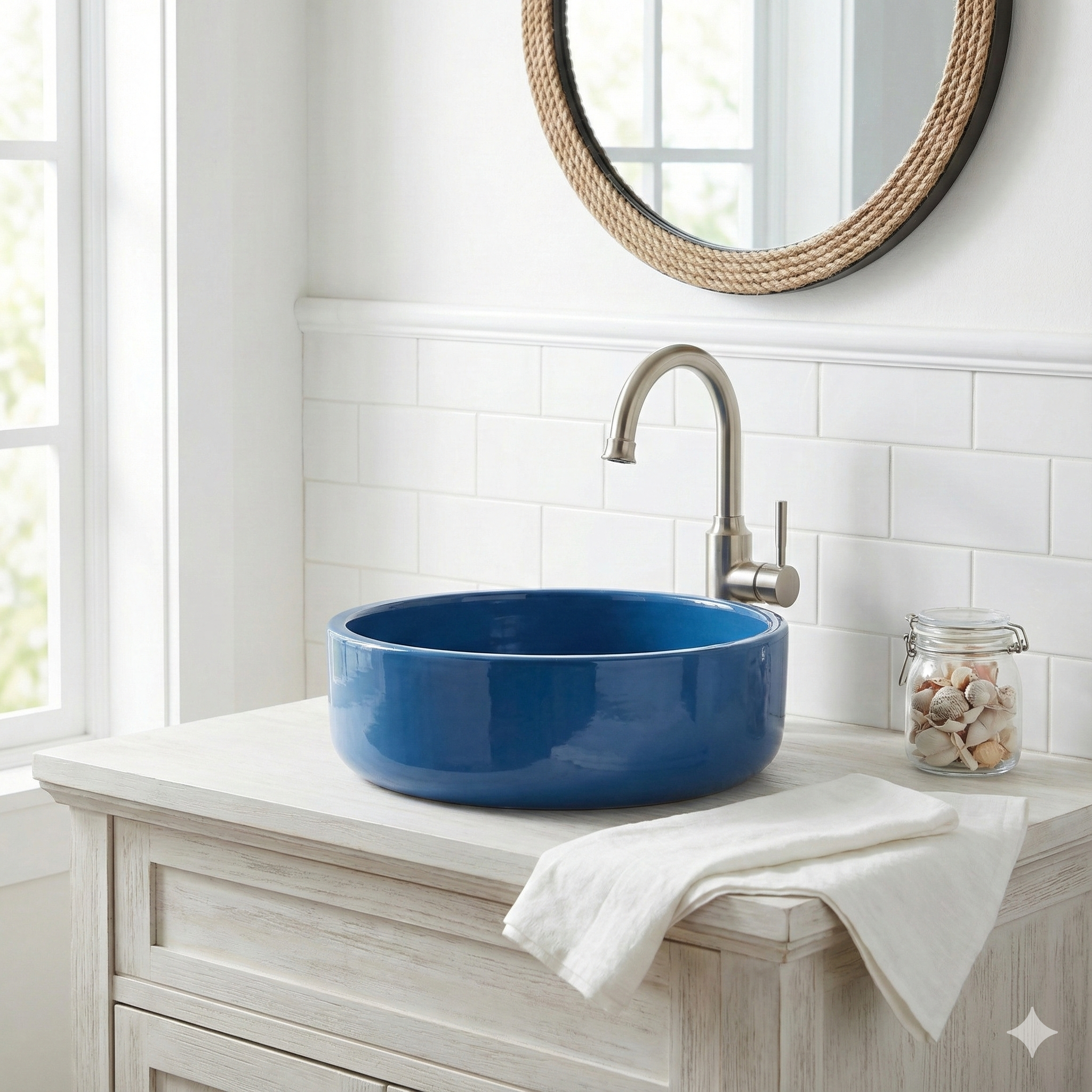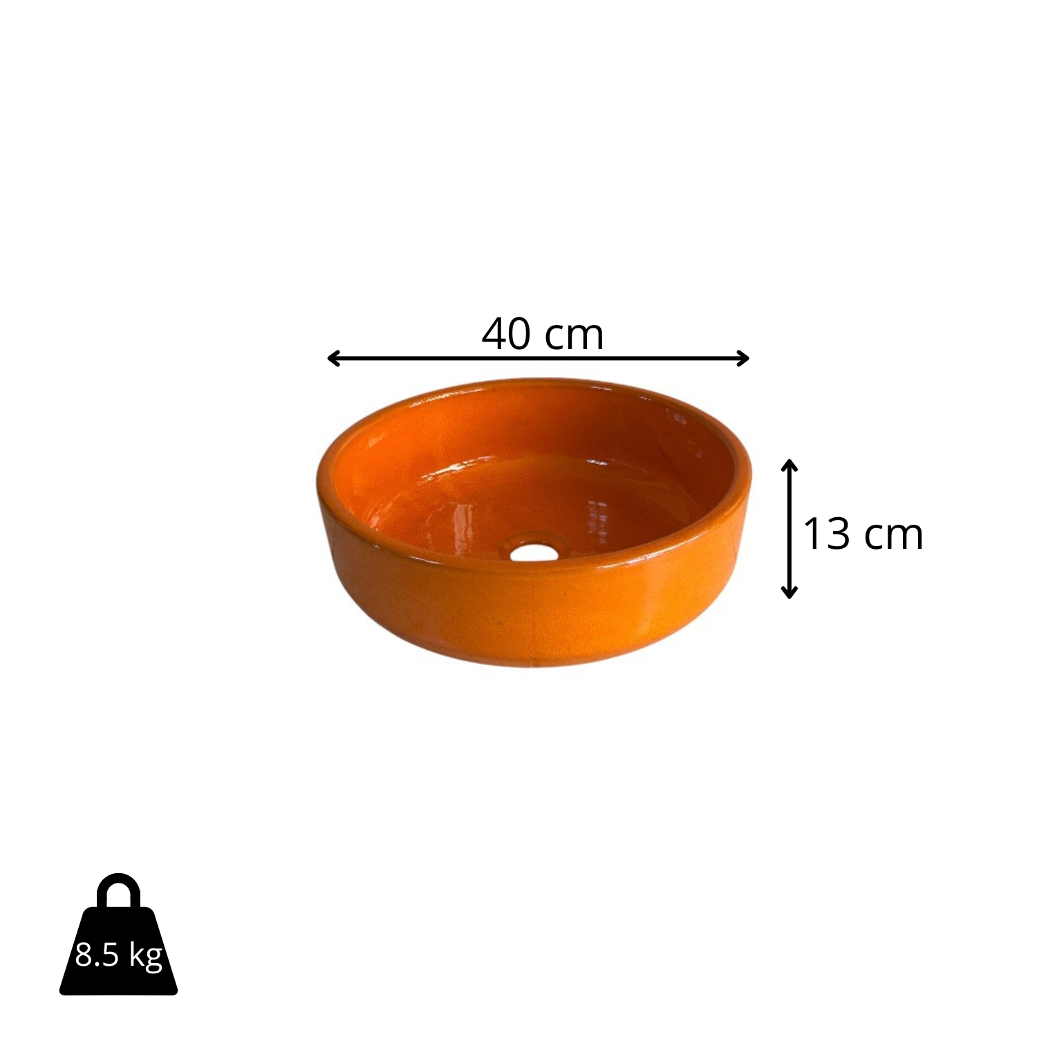 Este lavabo de cerámica esmaltada de 40 cm es una pieza con presencia, pensada para baños donde quieres que el lavabo sea protagonista. Su formato tipo cuenco y su acabado brillo aportan un aspecto limpio, decorativo y muy mediterráneo.