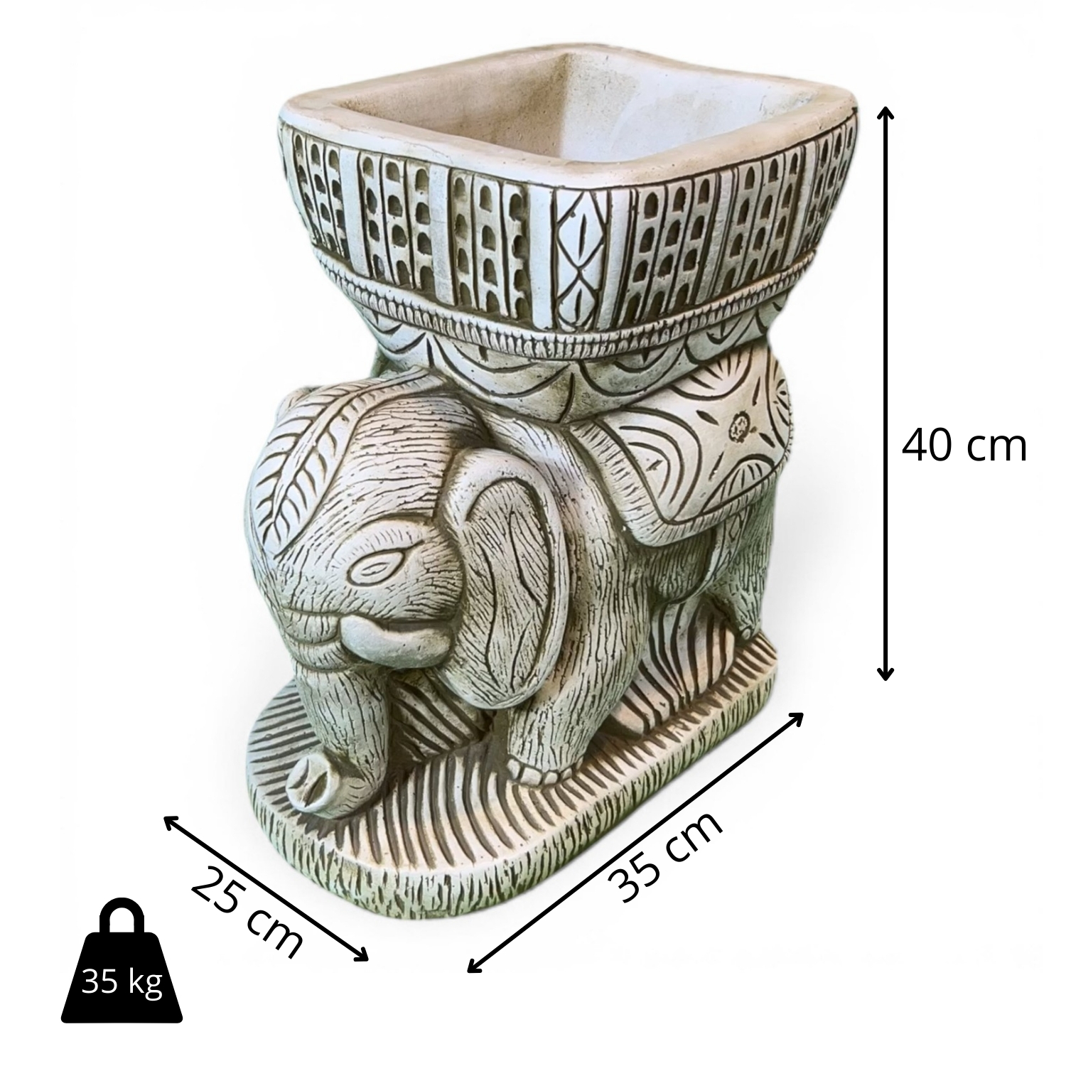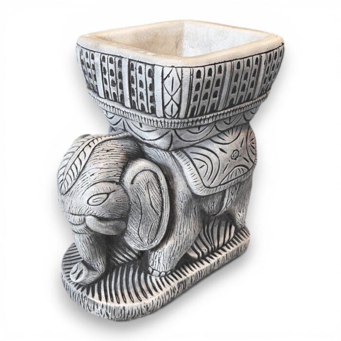 Esta maceta elefante de piedra es una pieza súper llamativa para darle personalidad a cualquier rincón exterior. Combina una base decorativa con forma de elefante y una cubeta superior cuadrada, creando un macetero con estilo étnico y un relieve muy trabajado que destaca al primer vistazo.