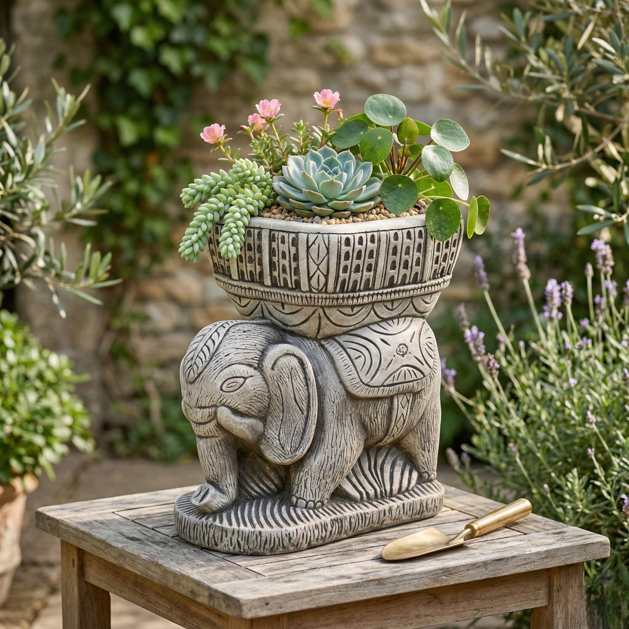 Queda genial con plantas de tamaño medio, composiciones con grava decorativa o cactus, y también como pieza decorativa incluso sin planta, por la fuerza visual que tiene el elefante y los detalles del relieve.