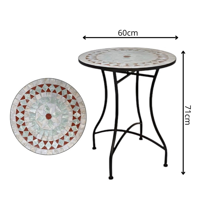 • Material: tablero de mosaico cerámico y estructura de forja.
