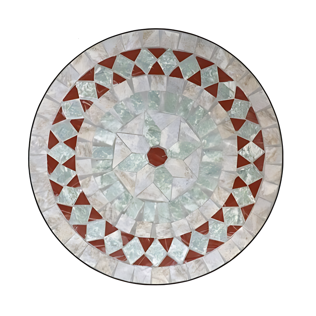 La mesa es redonda y tiene un diseño muy decorativo en la superficie. El tablero está hecho con un mosaico de piezas cerámicas en tonos blanco roto, grises y rojo.
