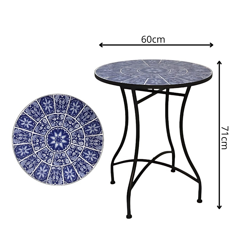 Mesa redonda de forja con mosaico en tonos azul y blanco – 60x71cm