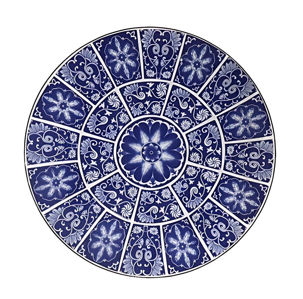La mesa es redonda y tiene un diseño muy decorativo en la superficie. El tablero está hecho con un mosaico de piezas cerámicas en tonos azul y blanco.