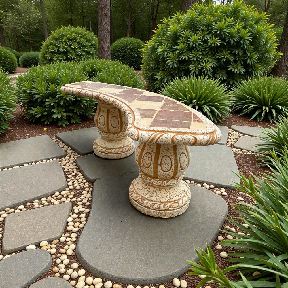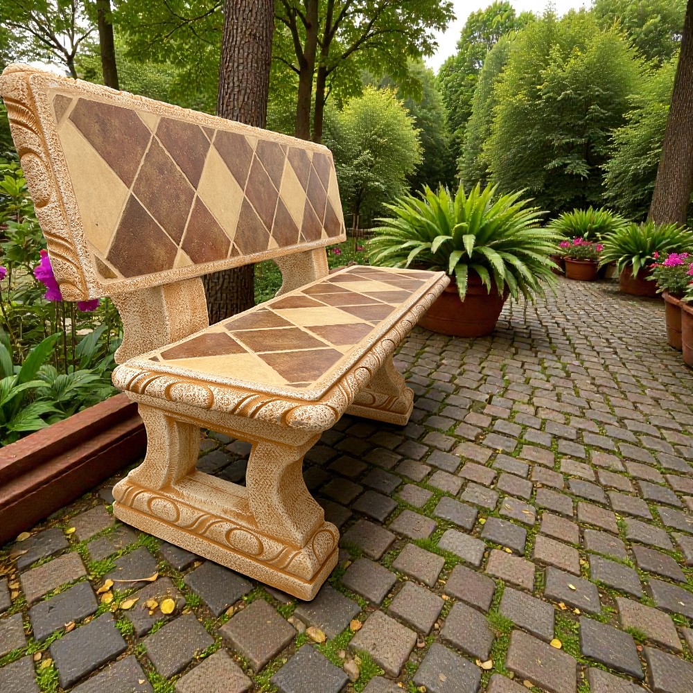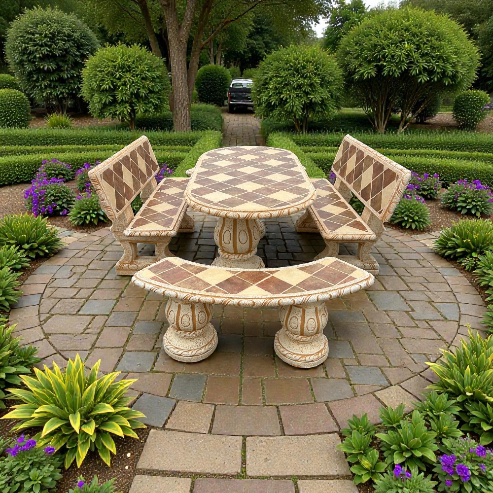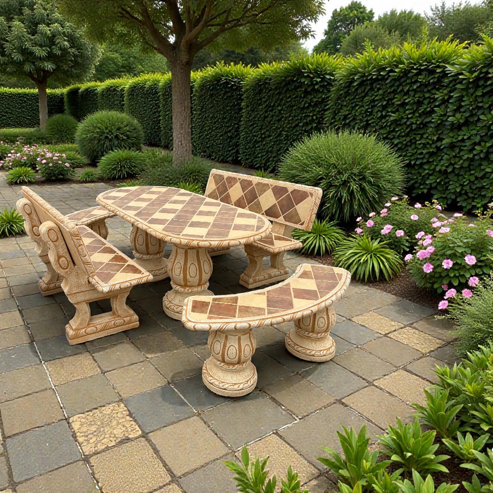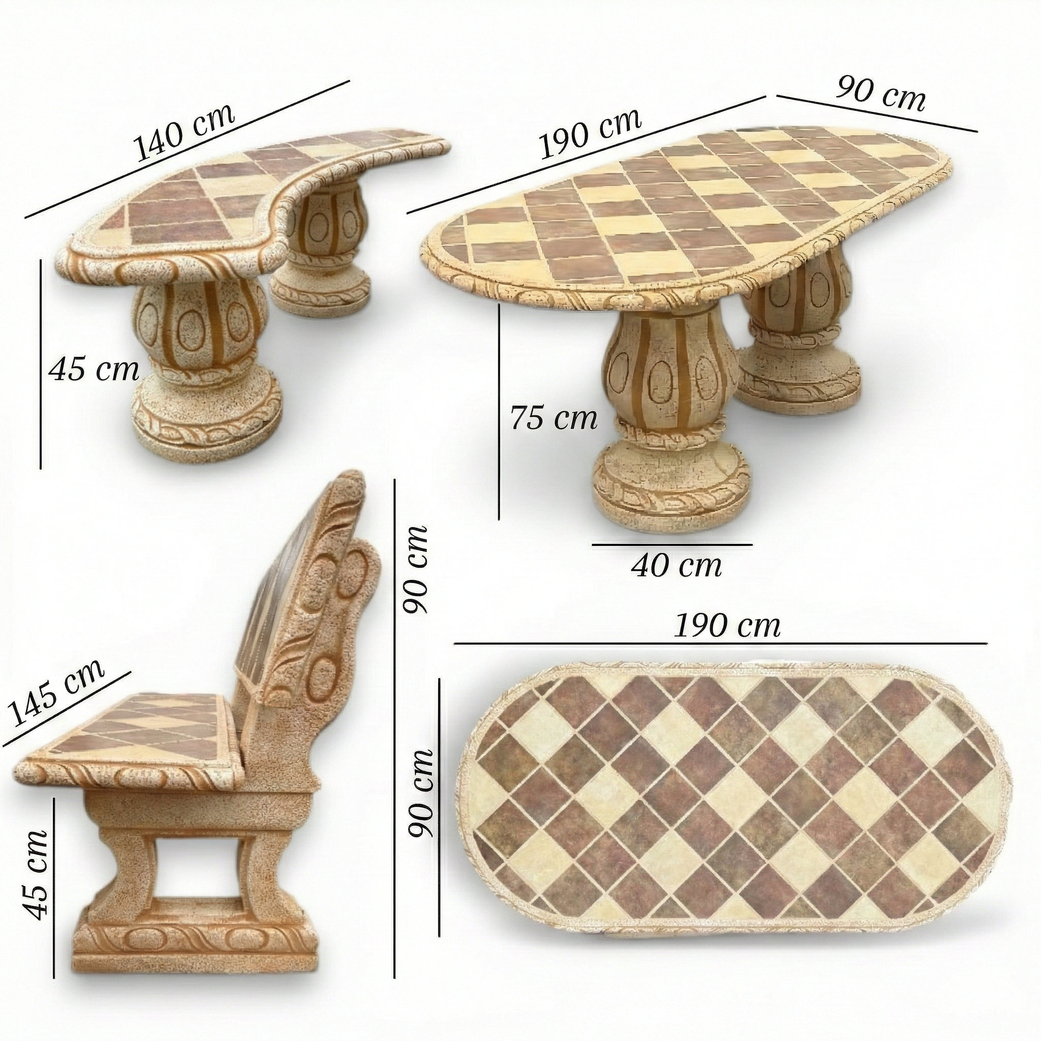 Convierte tu terraza o jardín en un auténtico comedor exterior con este conjunto de mesa ovalada y bancos de piedra, diseñado para disfrutar de comidas y sobremesas al aire libre con un estilo mediterráneo muy marcado. El tablero decorativo tipo mosaico en tonos tierra aporta calidez y personalidad, mientras que las bases tipo pedestal y los cantos trabajados le dan un aspecto sólido y elegante.