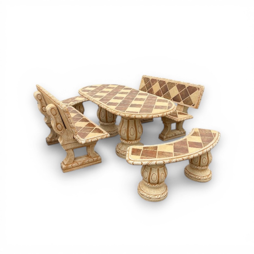 Diseño: conjunto comedor exterior con mesa ovalada y 4 bancos a juego (2 con respaldo + 2 curvos), con tablero decorativo tipo mosaico y bases tipo pedestal.