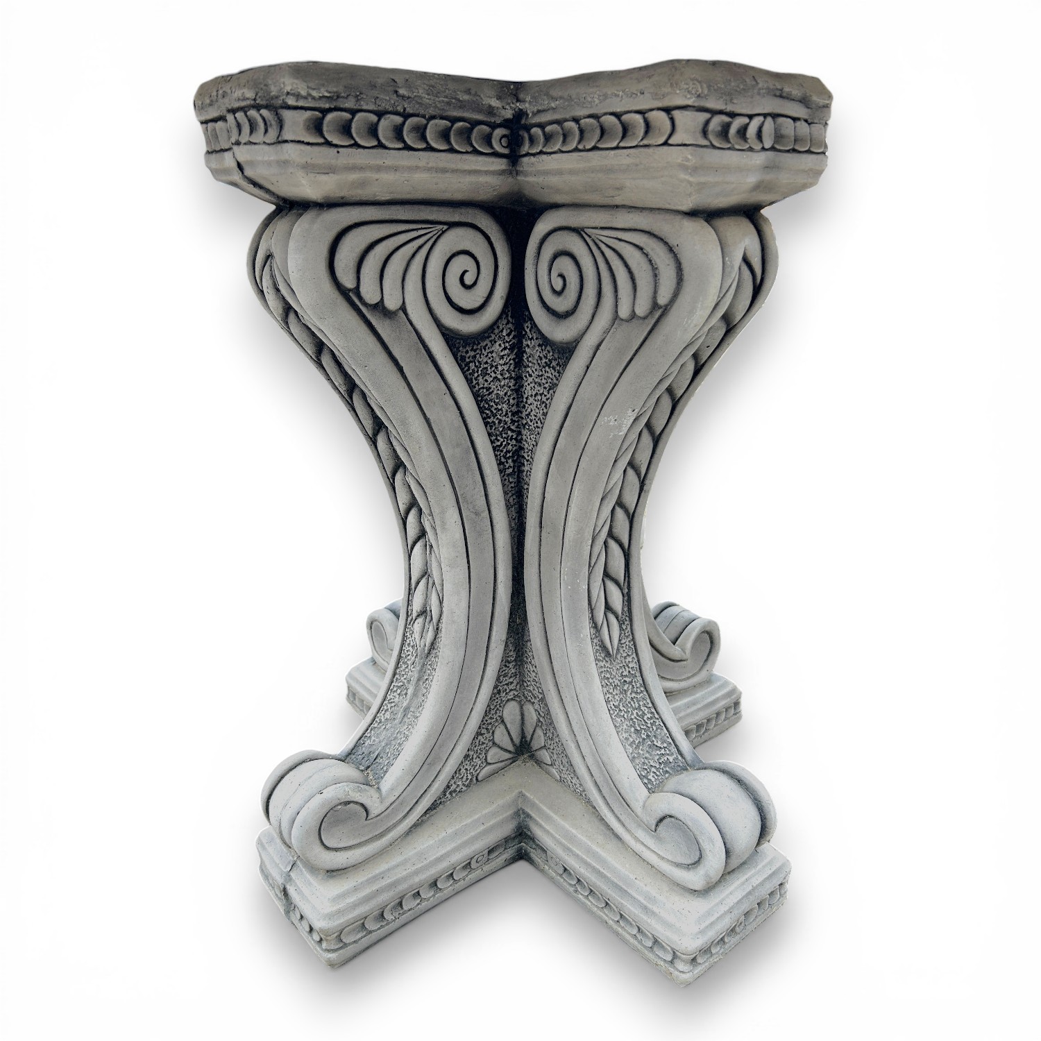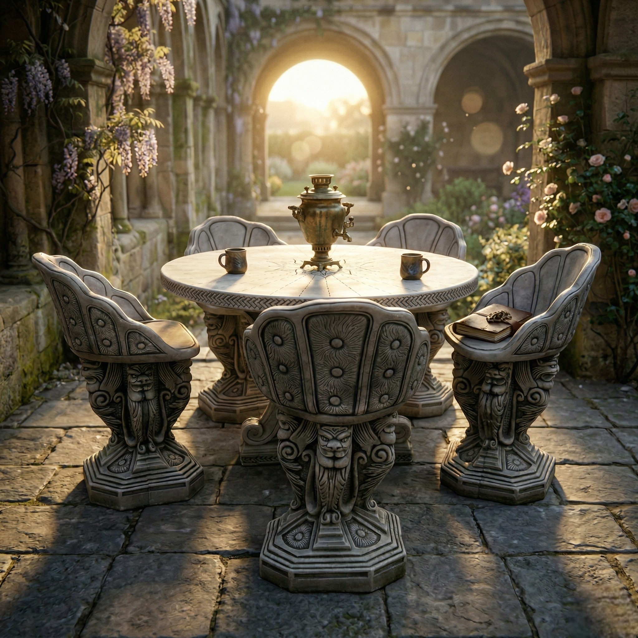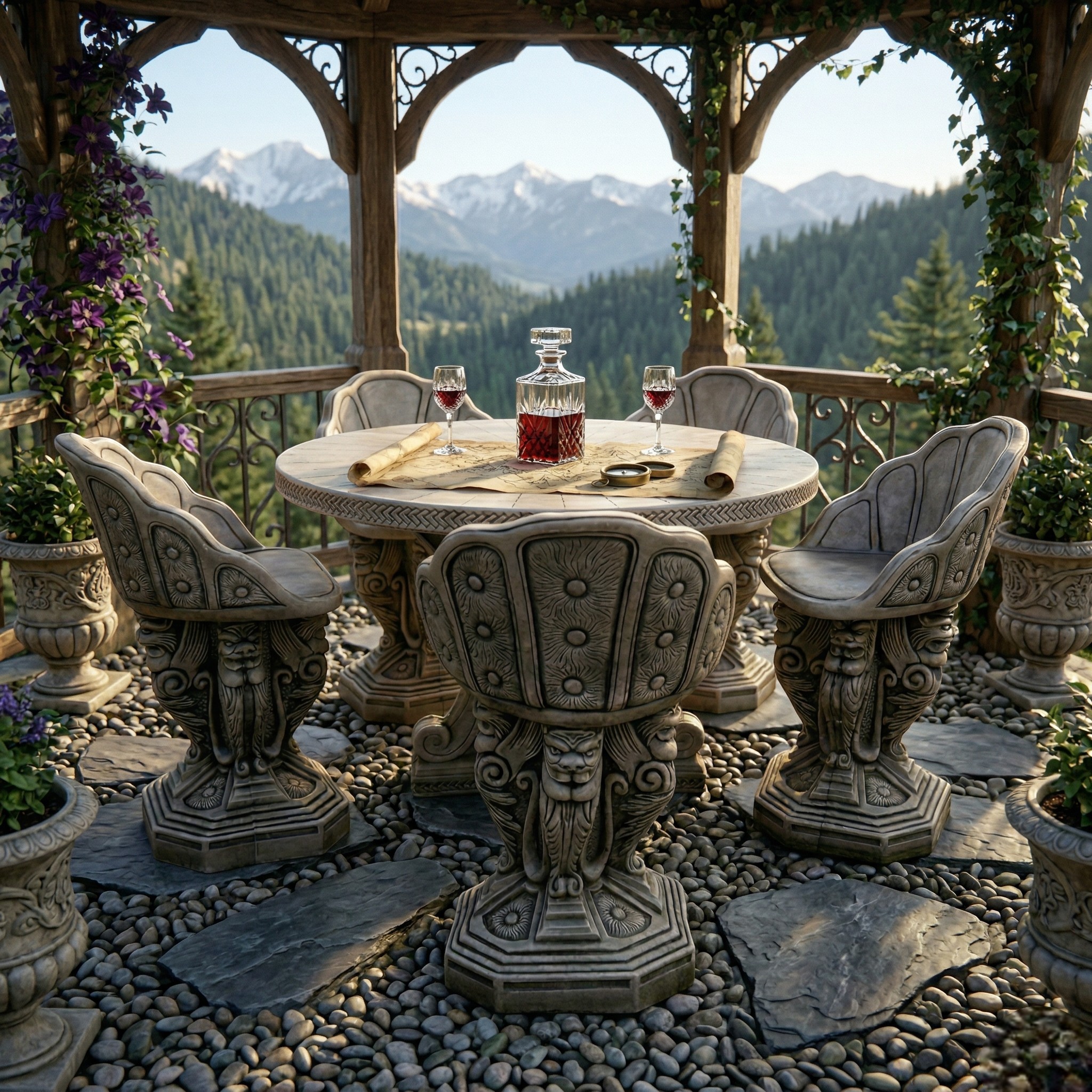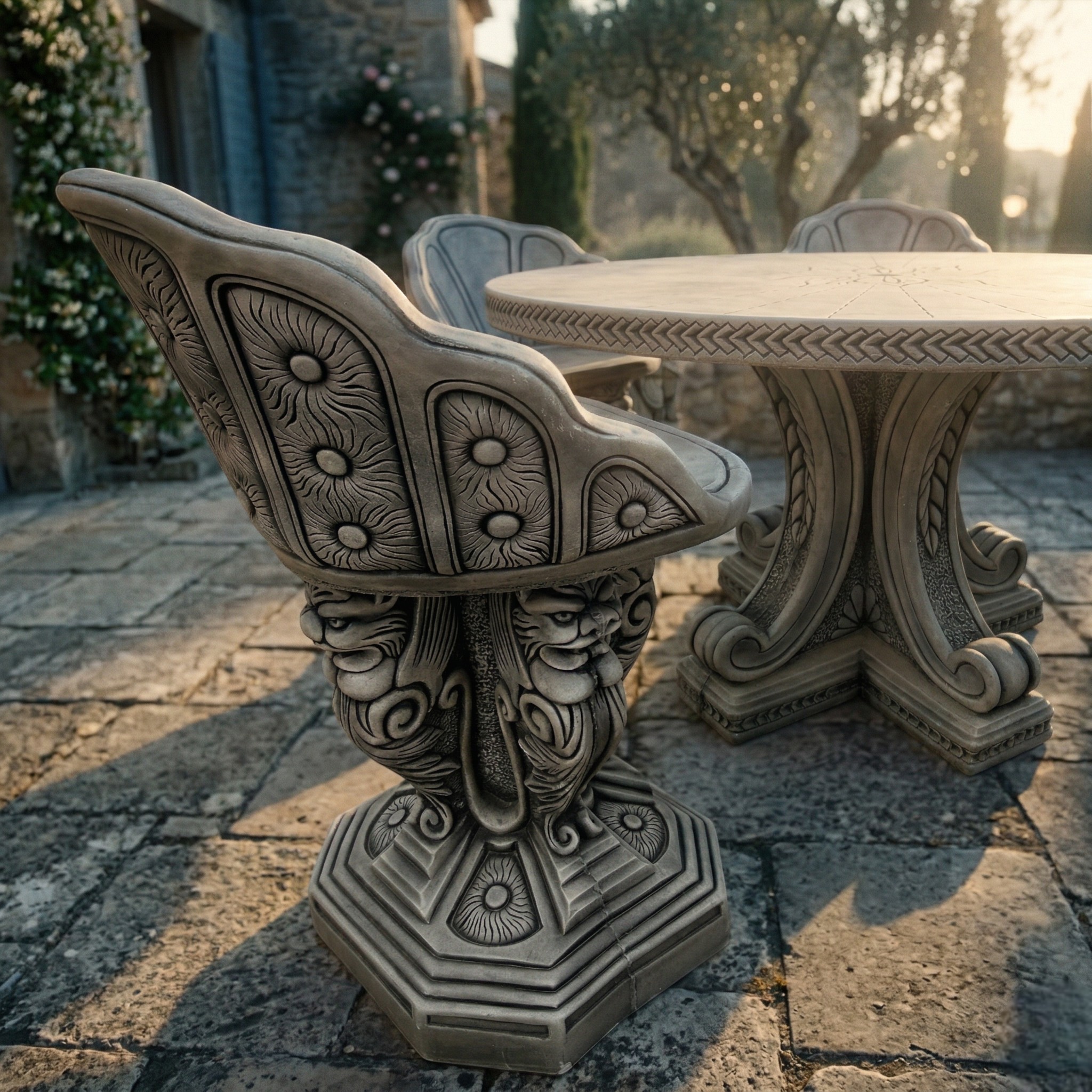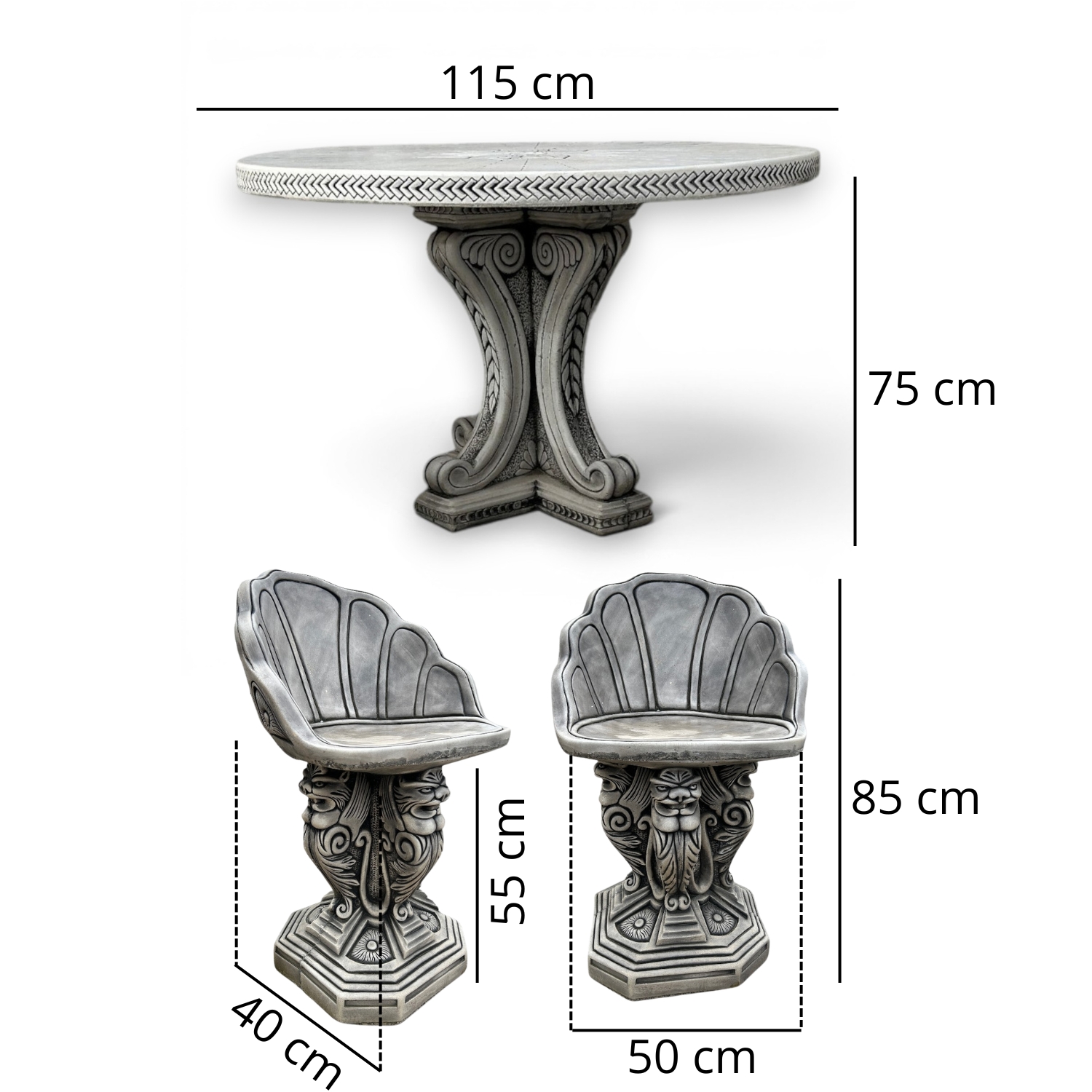 Lo que más destaca de este conjunto es su carácter ornamental. Tanto la mesa como los sillones presentan relieves decorativos y bases con gran fuerza visual, inspiradas en una estética clásica que convierte el conjunto en un auténtico protagonista del espacio. La mesa redonda favorece una distribución equilibrada y acogedora, perfecta para reuniones, comidas o momentos de descanso al aire libre.