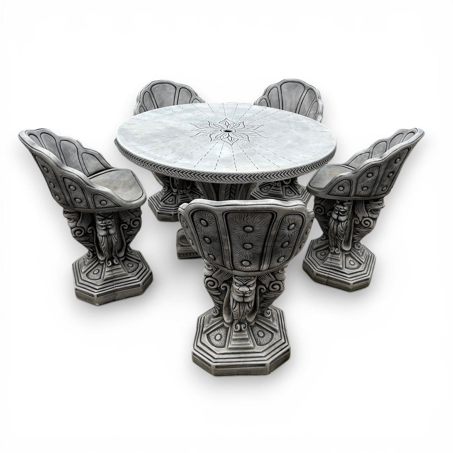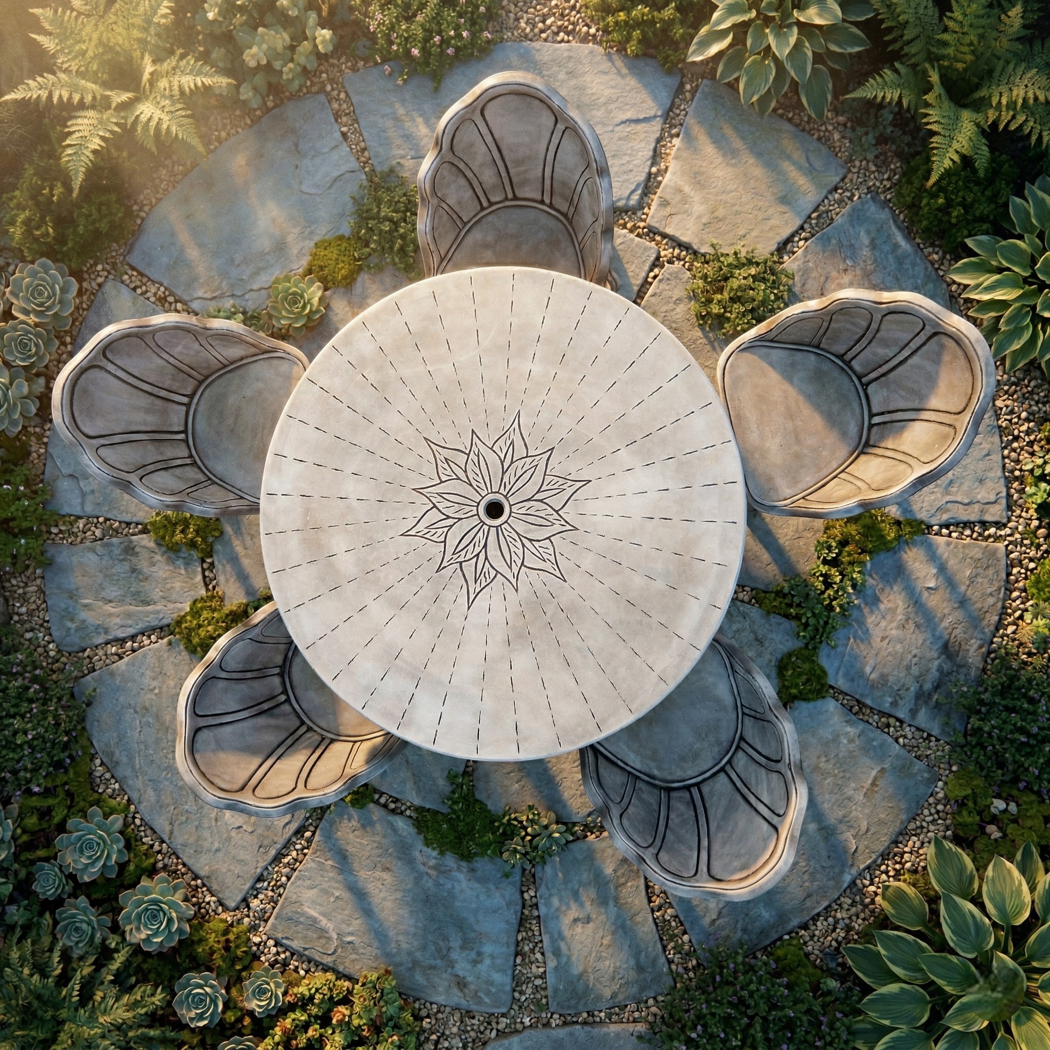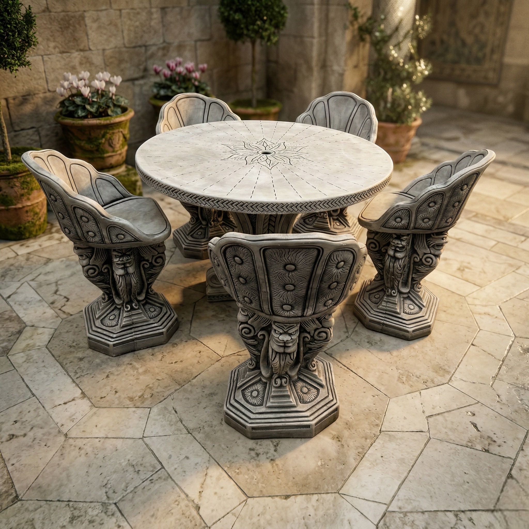 Este conjunto de mesa redonda de piedra artificial para exterior es una opción perfecta para quienes buscan una pieza decorativa con mucha personalidad, presencia y un diseño fuera de lo común. Su composición, formada por 1 mesa redonda y 5 sillones individuales, crea un rincón exterior elegante y muy llamativo, ideal para jardines, terrazas y patios con un estilo más distinguido.