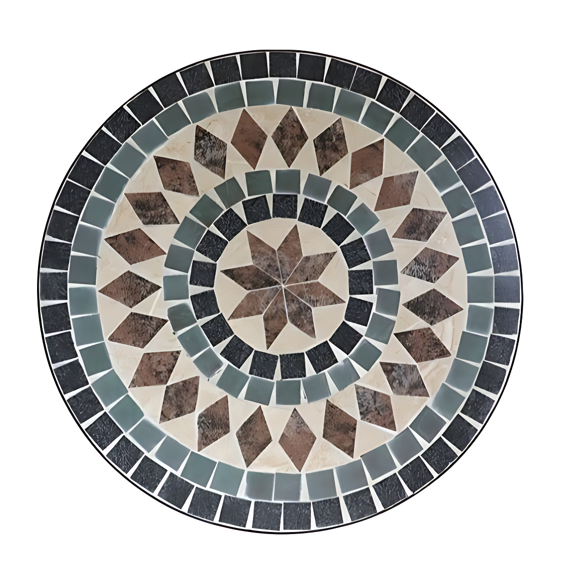 La mesa es redonda y tiene un diseño muy decorativo en la superficie. El tablero está hecho con un mosaico de piedra en tonos marrones, beige claro, negro y verde grisáceo, que simula una estrella en el centro.