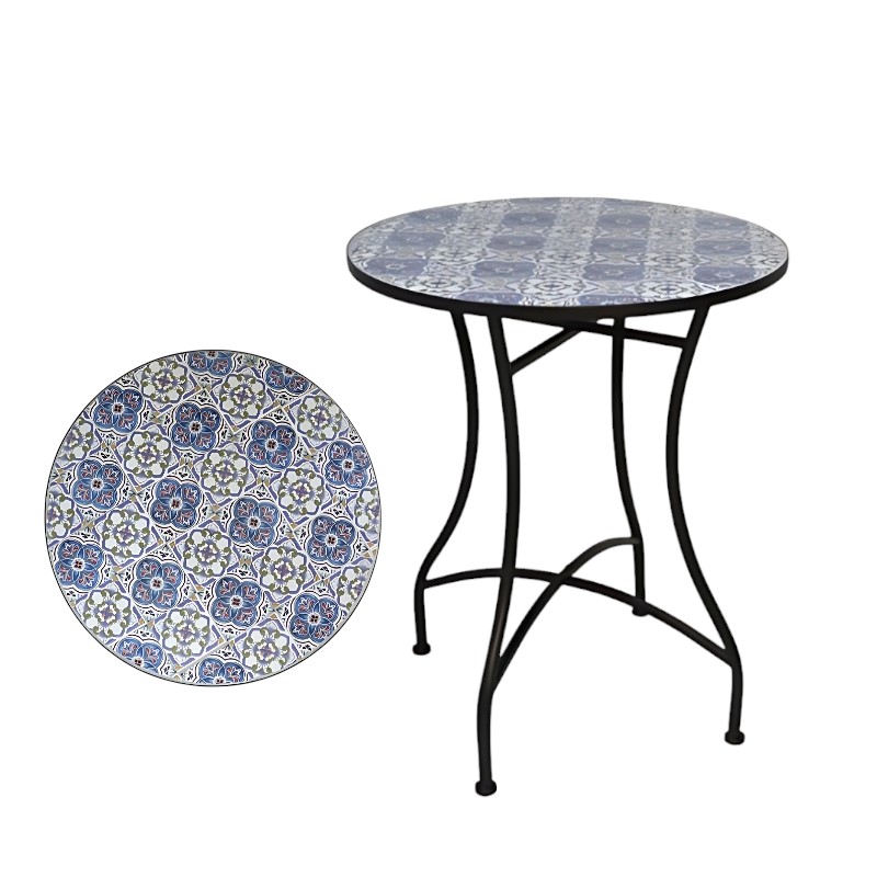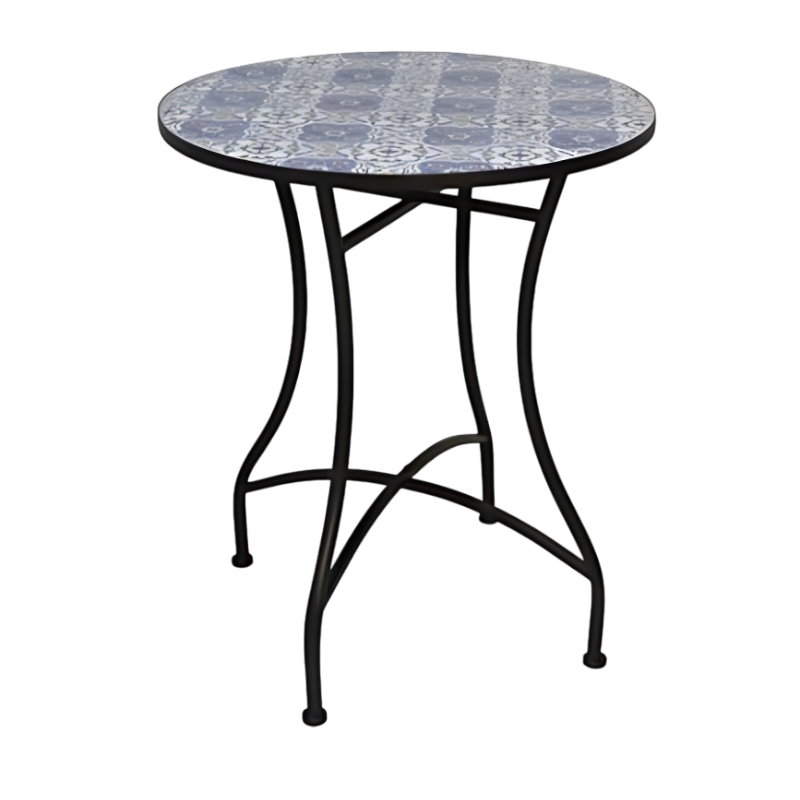 Mesa redonda de forja con mosaico geométrico floral – 60x71cm