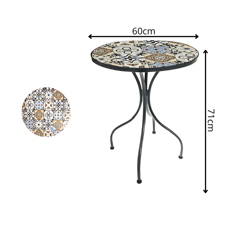 Mesa redonda de forja con mosaico vintage – 60x71cm