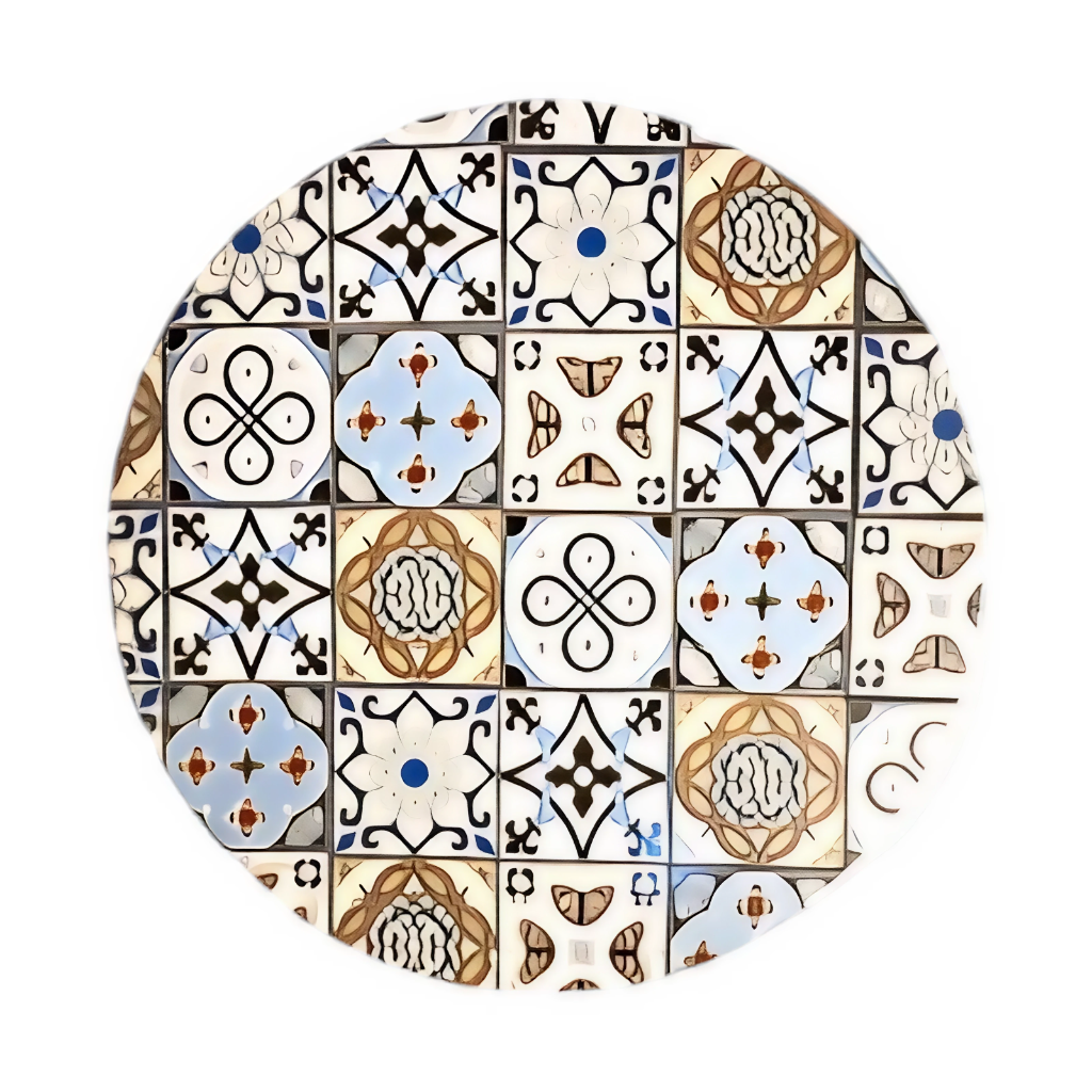 La mesa es redonda y tiene un diseño muy decorativo en la superficie. El tablero está hecho con un mosaico de piezas cerámicas  en tonos azules, beige, marrón y negro creando un diseño único y llamativo