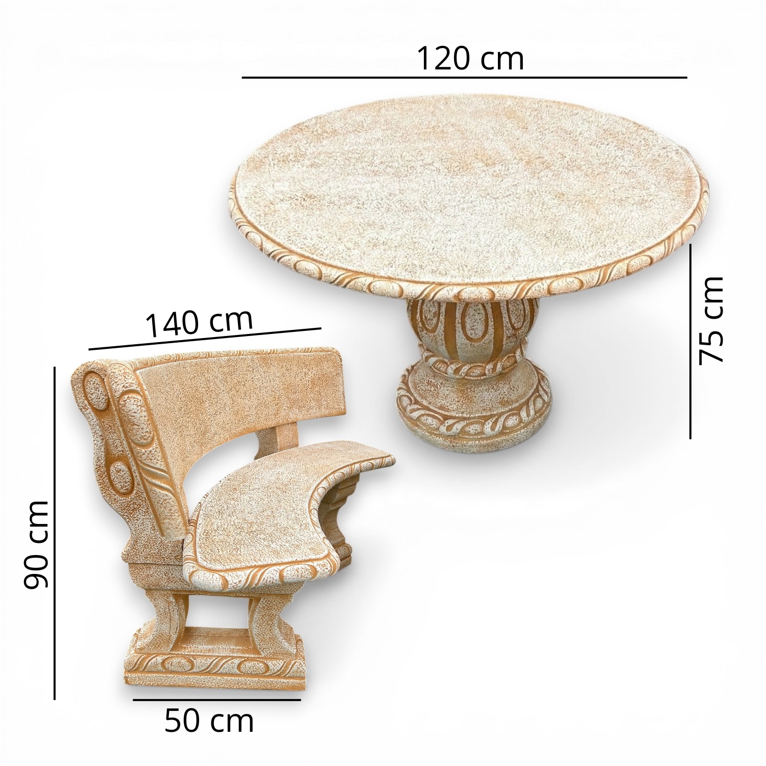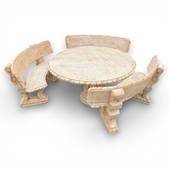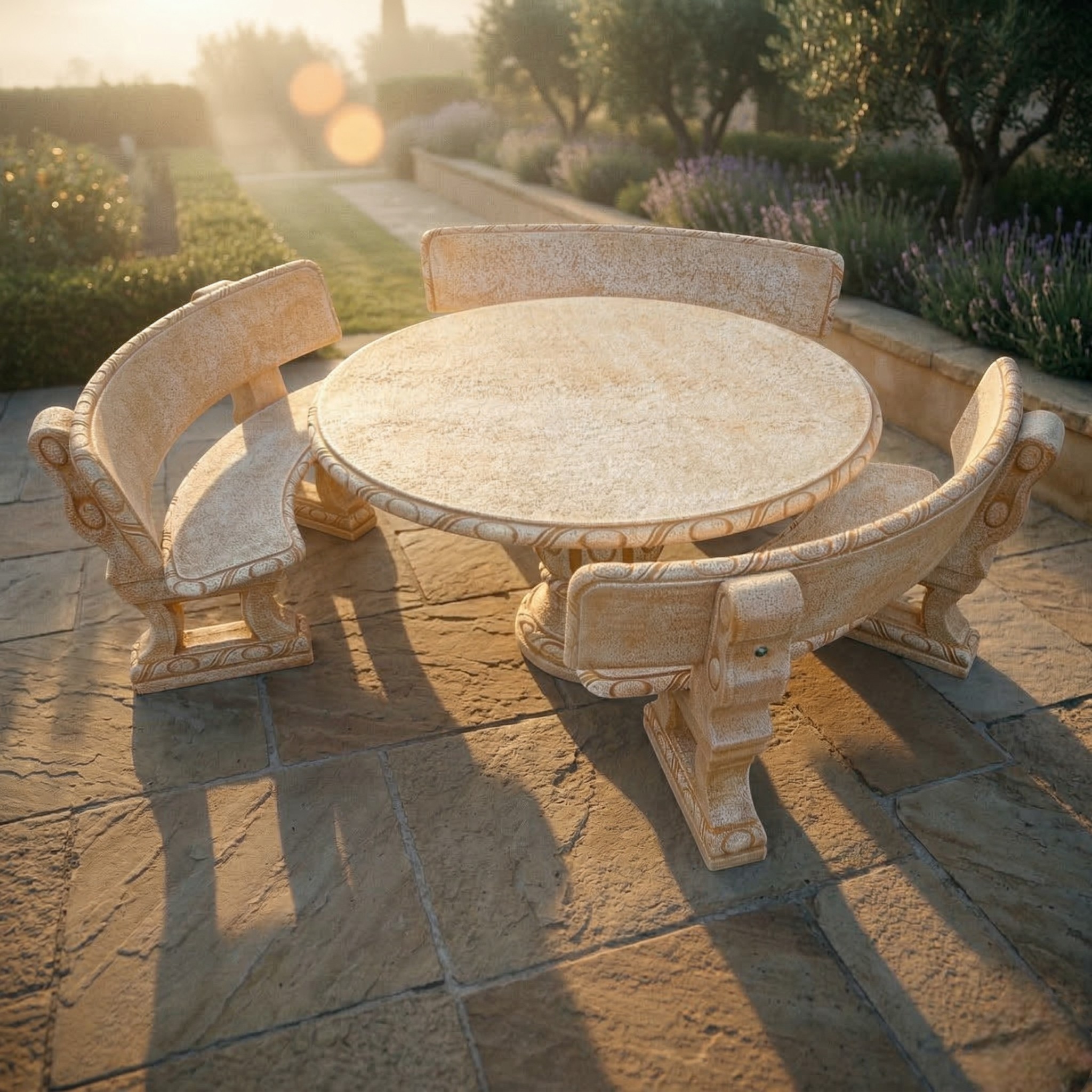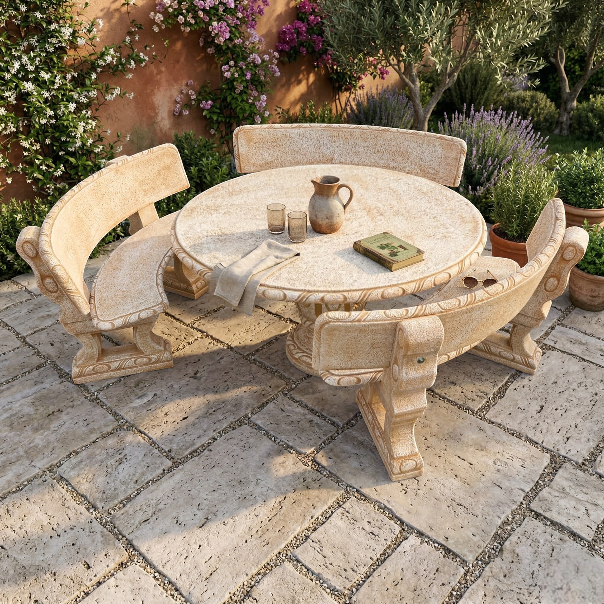 Diseño: Mesa redonda con pedestal + 3 bancos curvos con respaldo, estilo clásico mediterráneo