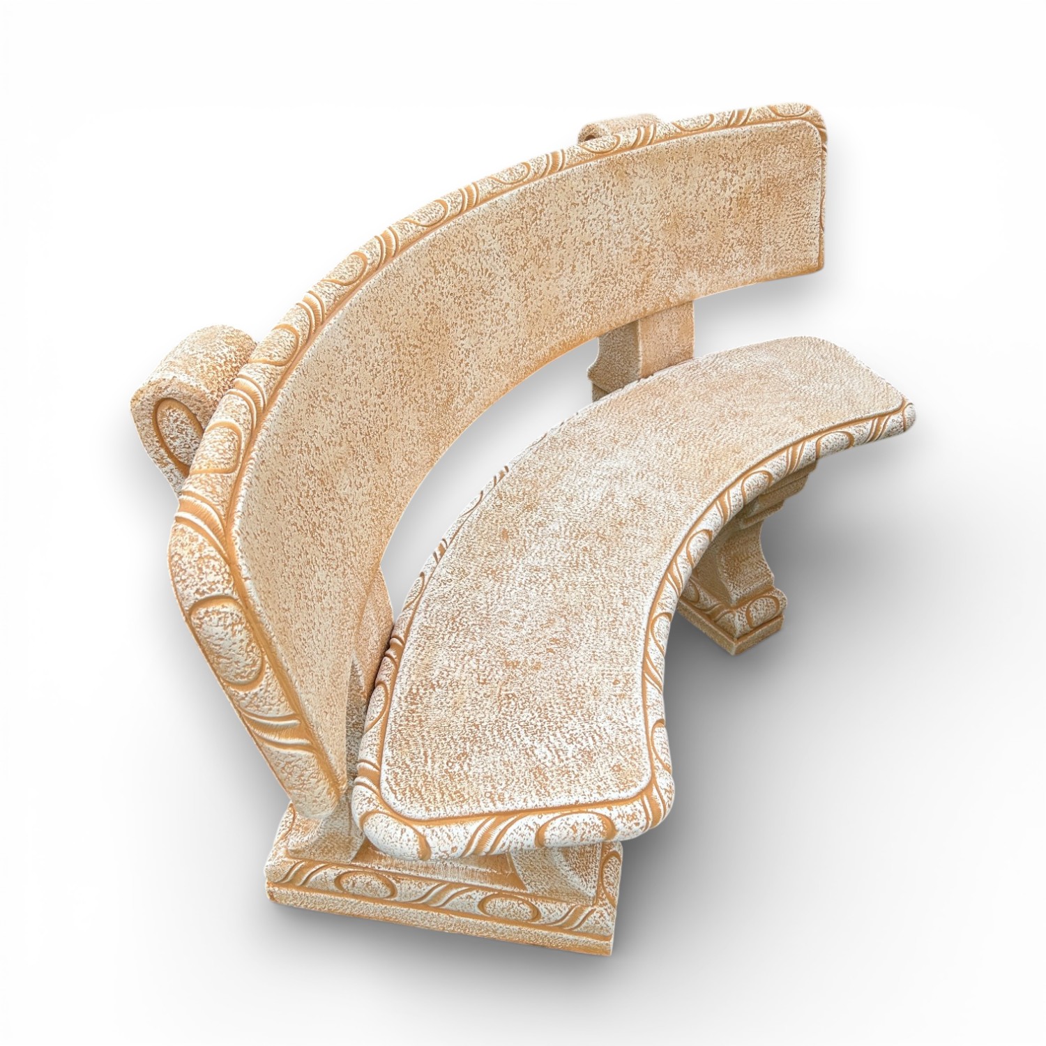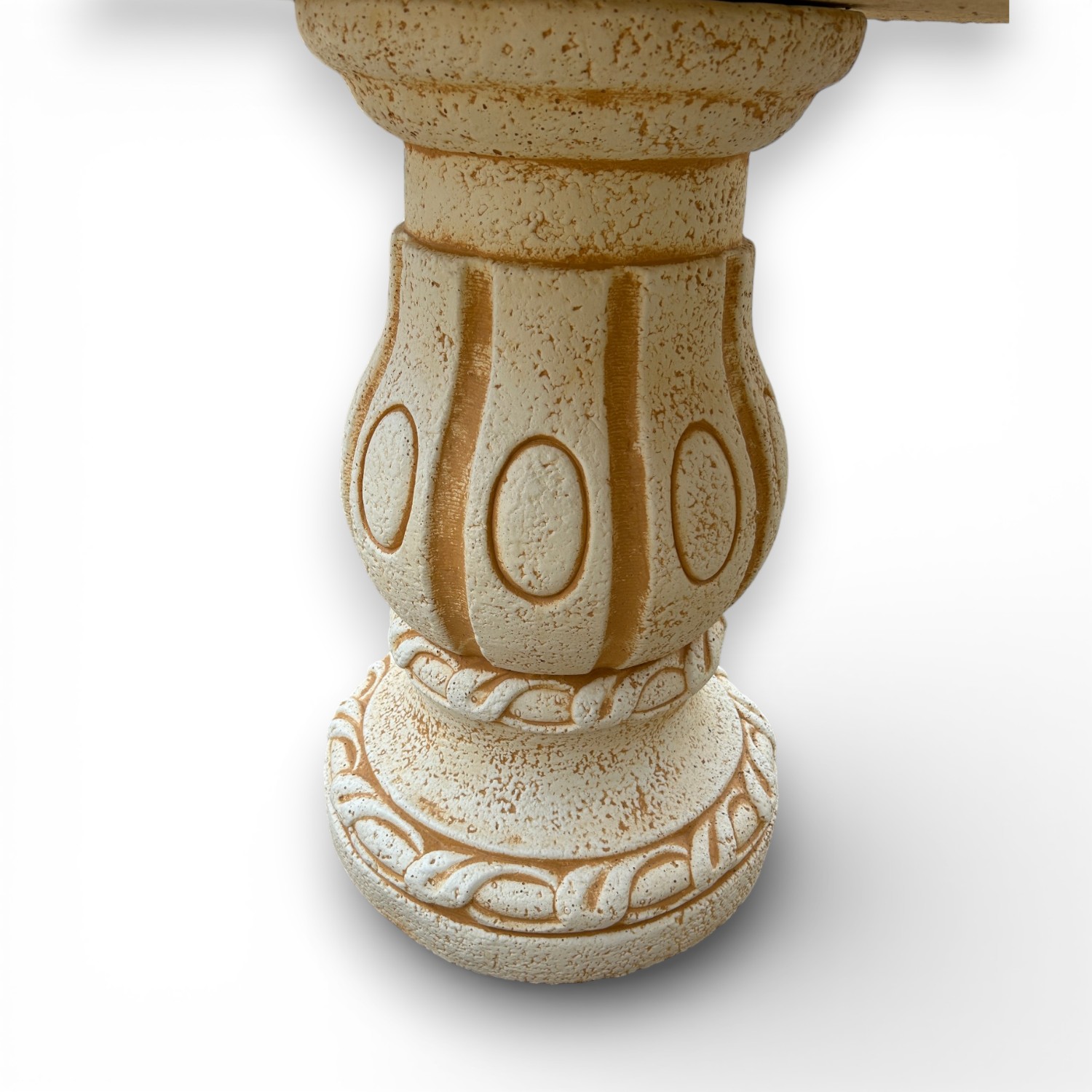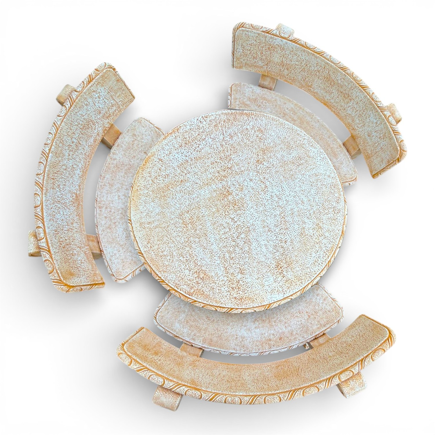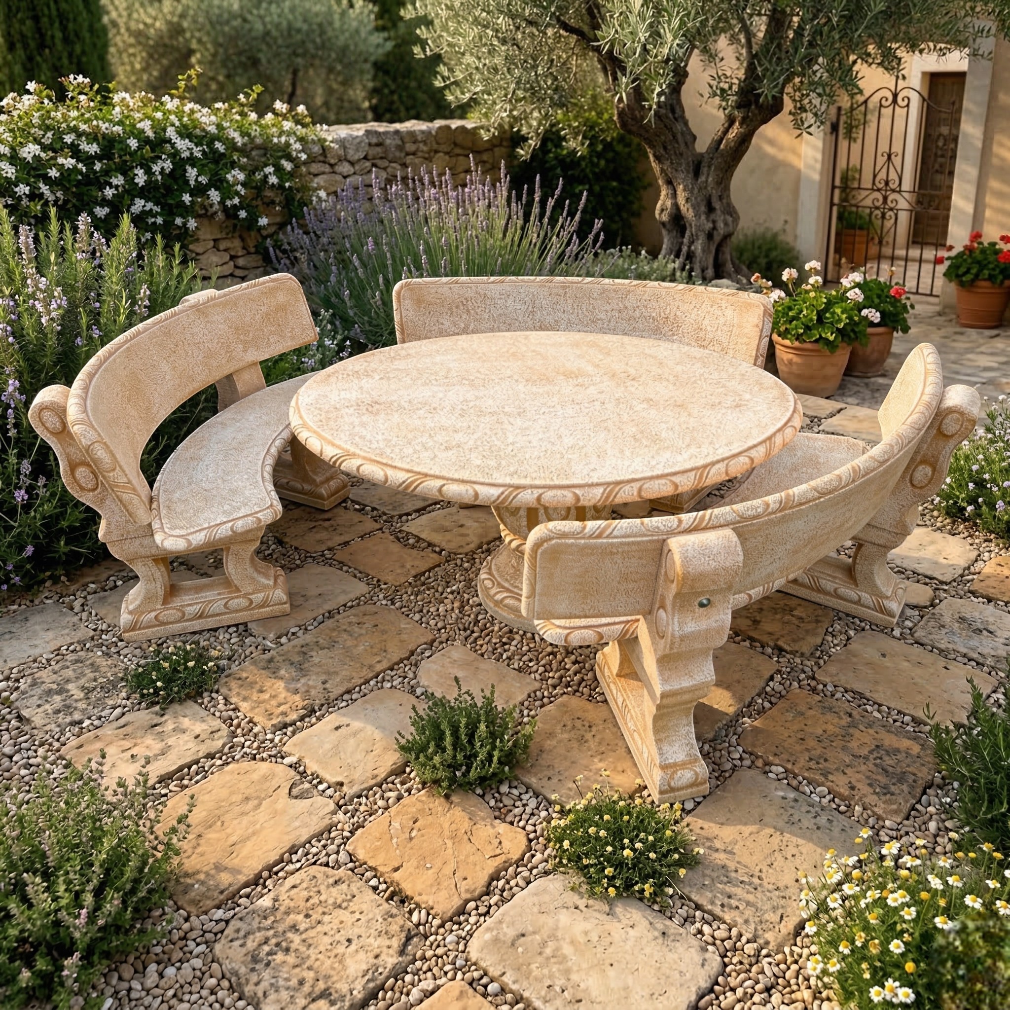 Diseño: Mesa redonda con pedestal + 3 bancos curvos con respaldo, estilo clásico mediterráneo
