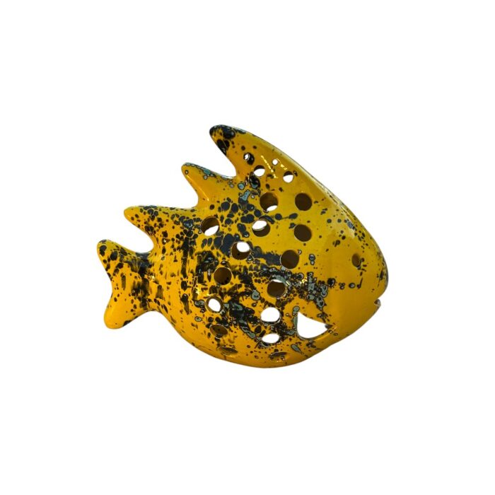 Este llamativo pez decorativo de cerámica en color destaca por su exclusivo diseño jaspeado en tonos negros y verdes, que le aporta un estilo moderno y artístico. Su cuerpo calado con pequeños orificios permite proyectar luz, creando un efecto decorativo único y acogedor en cualquier espacio.