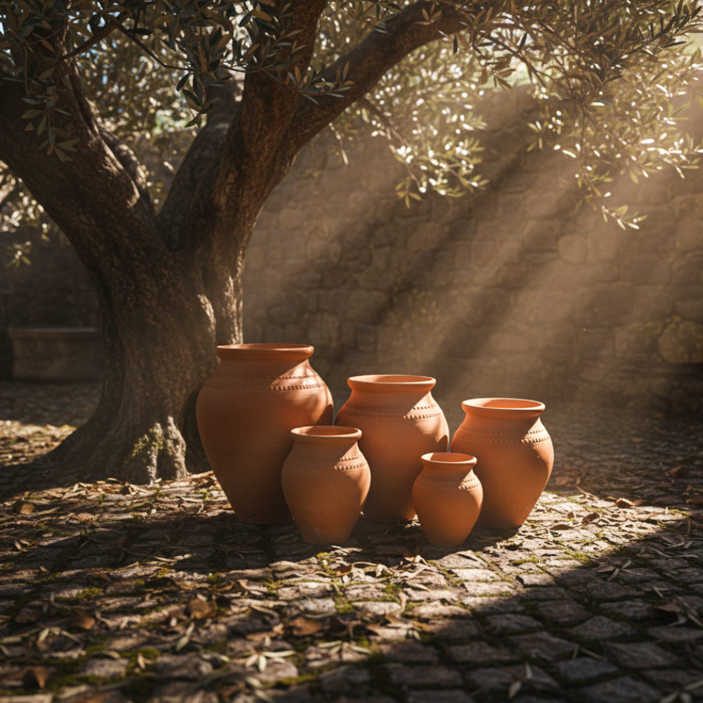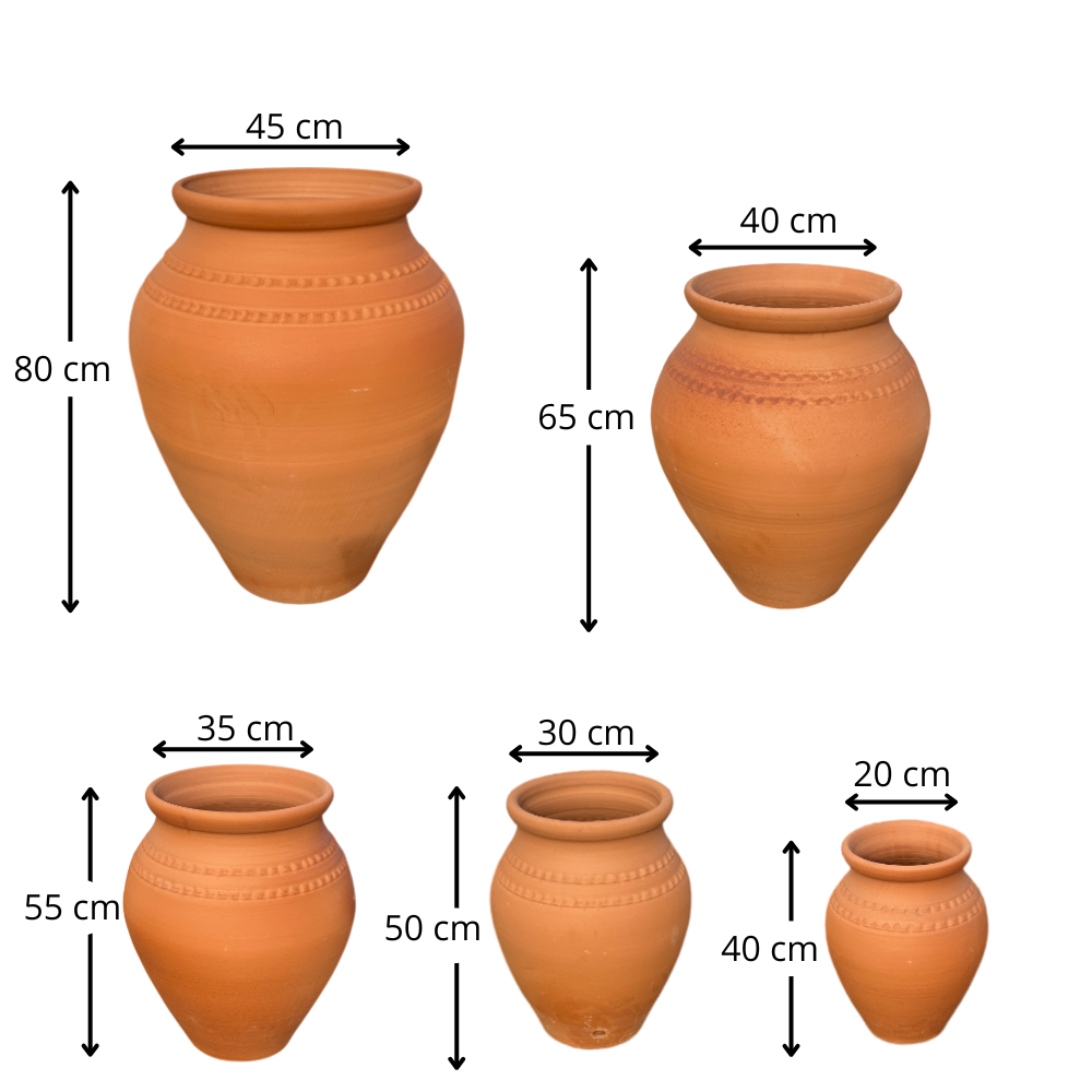 Estas tinajas de terracota son un clásico mediterráneo que aporta calidez y autenticidad a cualquier espacio. Están hechas de barro cocido, con el color natural de la terracota y un relieve decorativo artesanal que les da ese look tradicional que nunca pasa de moda. Son piezas con mucha presencia, perfectas para vestir un patio, una terraza o una entrada con un toque de “casa de campo” o estilo ibicenco.