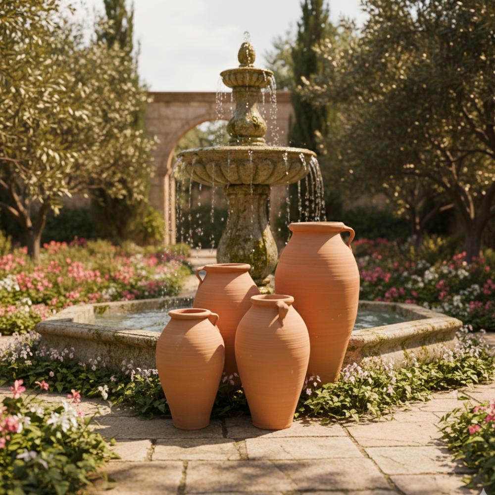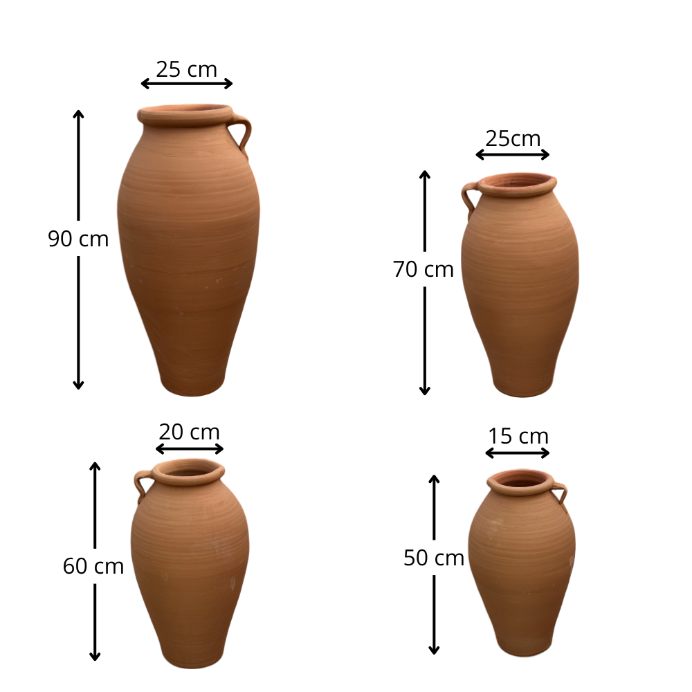 Estas tinajas altas de terracota con asa aportan un toque mediterráneo auténtico y elegante a cualquier exterior. Su forma estilizada y su color terracota natural hacen que queden perfectas en entradas, patios, porches y terrazas, creando un ambiente cálido y tradicional que combina muy bien con piedra, madera, cerámica y plantas verdes.