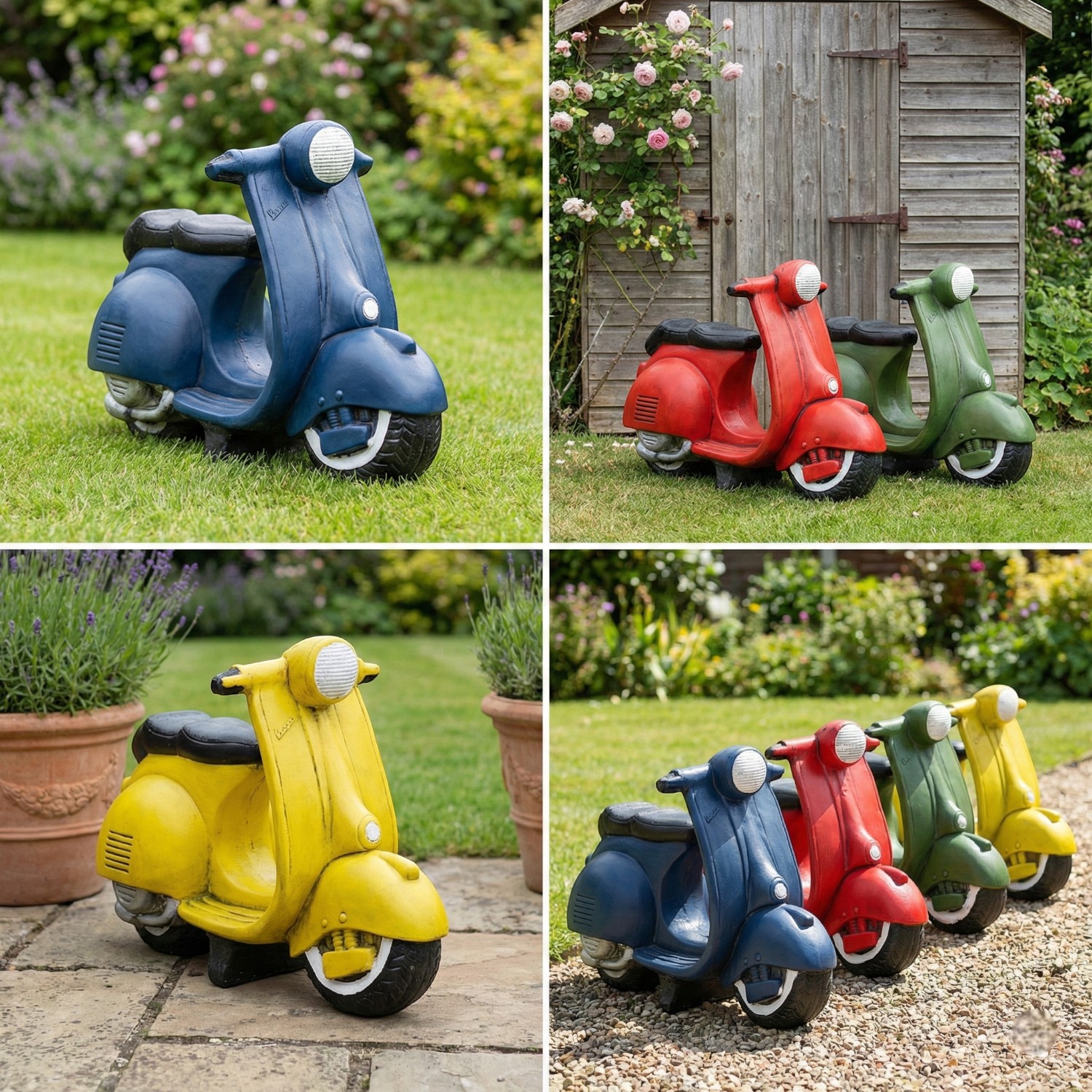 Al ser una figura maciza y apta 100% para exterior, está pensada para lucir sin preocupaciones en jardín, porche o zona de piscina. También funciona genial en interior como pieza protagonista en estanterías amplias, recibidores o espacios temáticos. Está disponible en varios colores (amarillo, rojo, verde, azul y blanco), ideal para elegir tu favorito o combinar varias Vespas y crear un conjunto decorativo más llamativo.